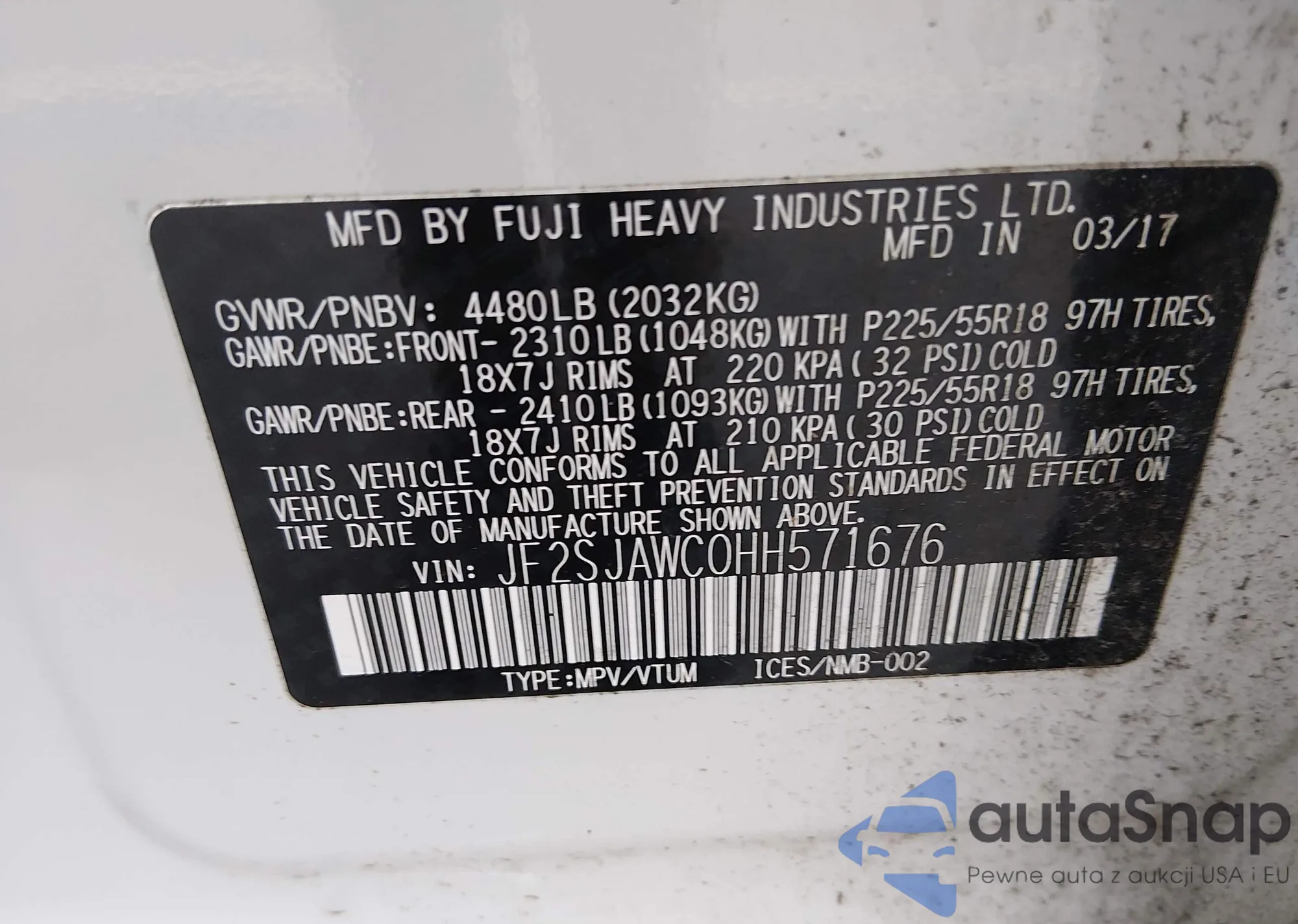 LOT: 44489001 VIN: JF2SJAWC0HH571676
