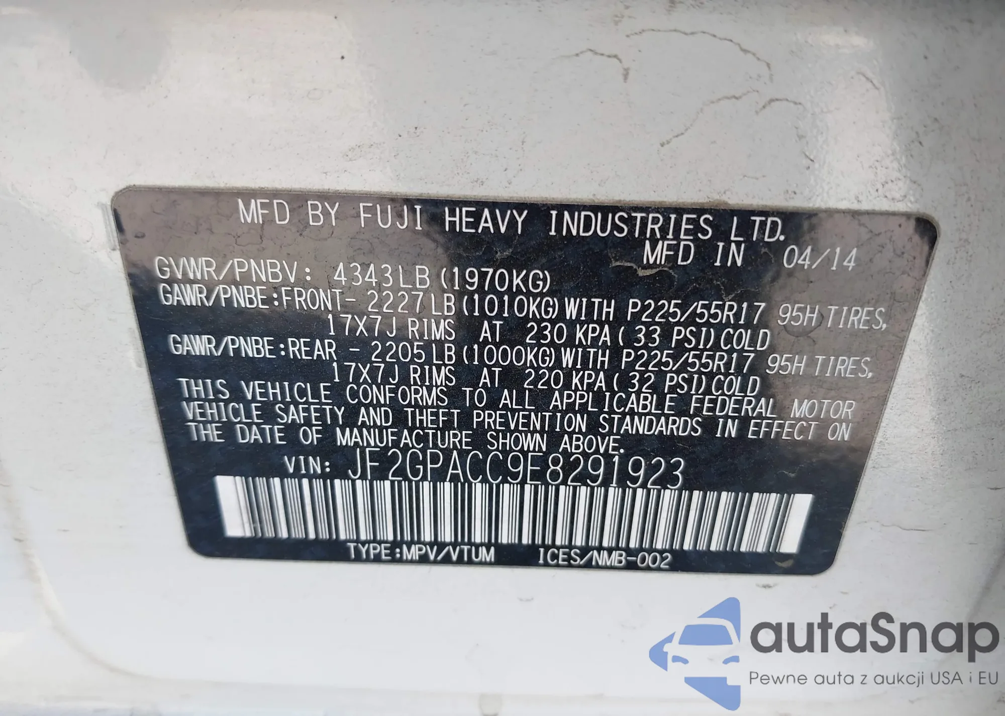 LOT: 38312193 VIN: JF2GPACC9E8291923