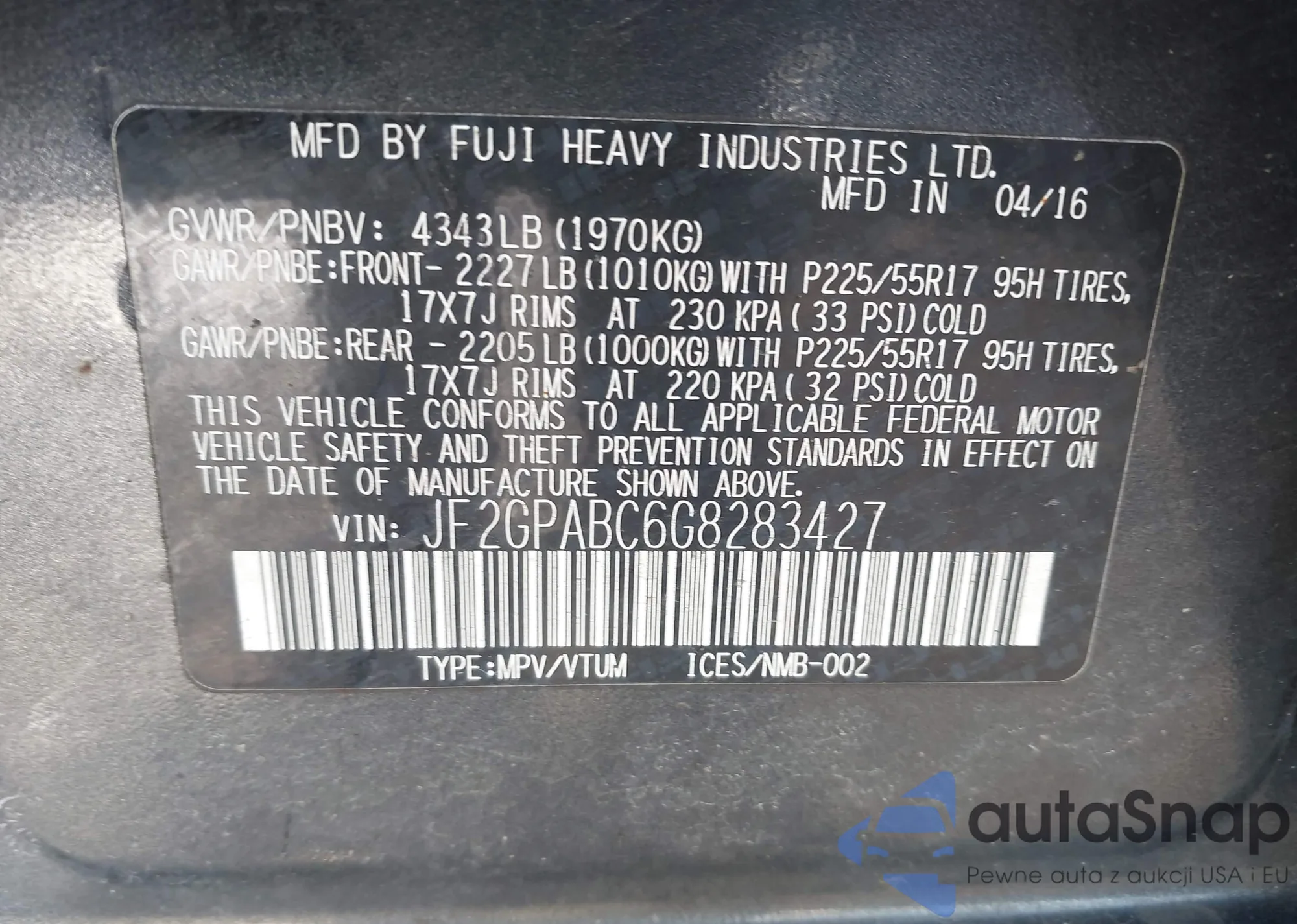 LOT: 44135053 VIN: JF2GPABC6G8283427