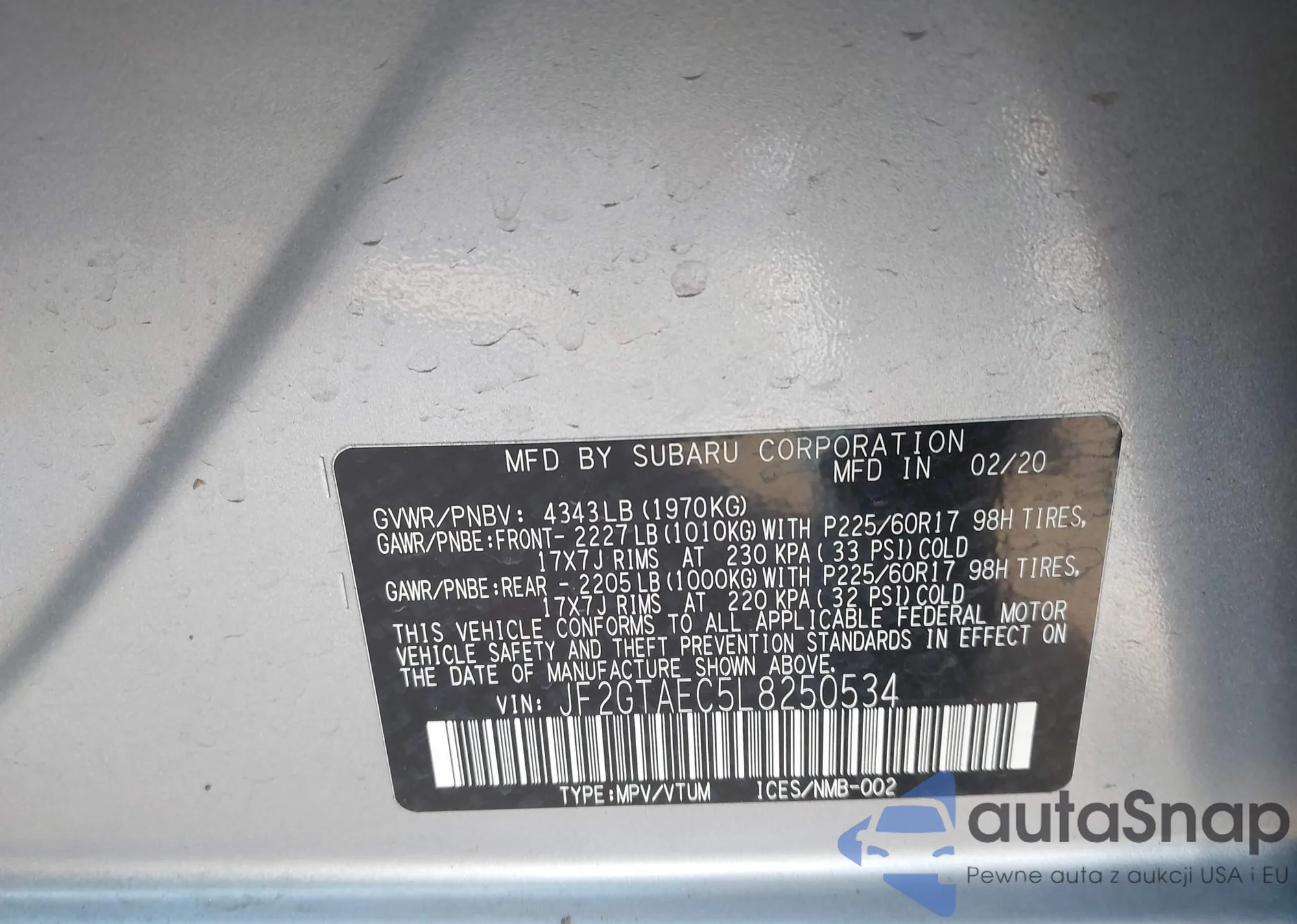 LOT: 43703783 VIN: JF2GTAEC5L8250534