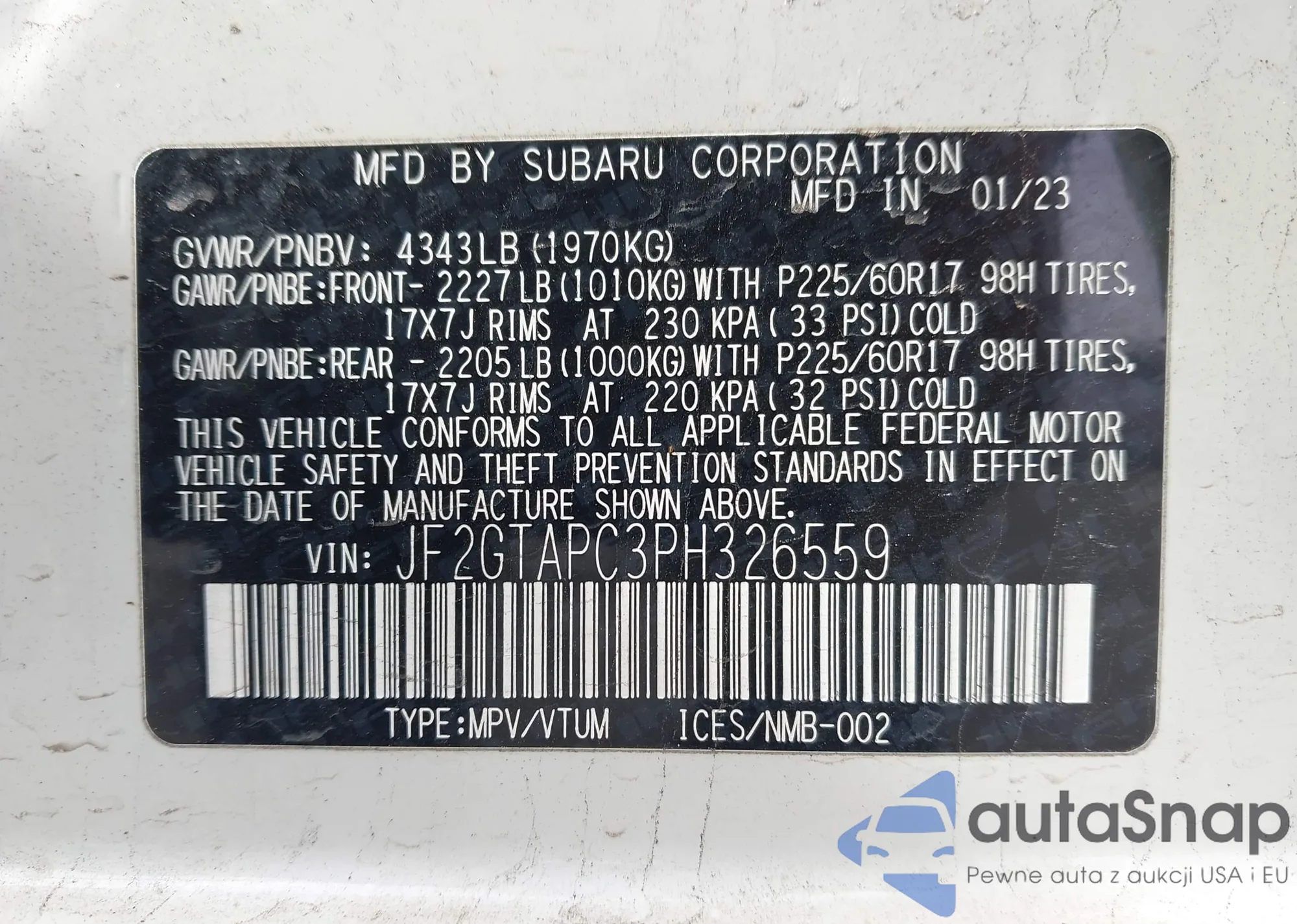 • VIN JF2GTAPC3PH326559