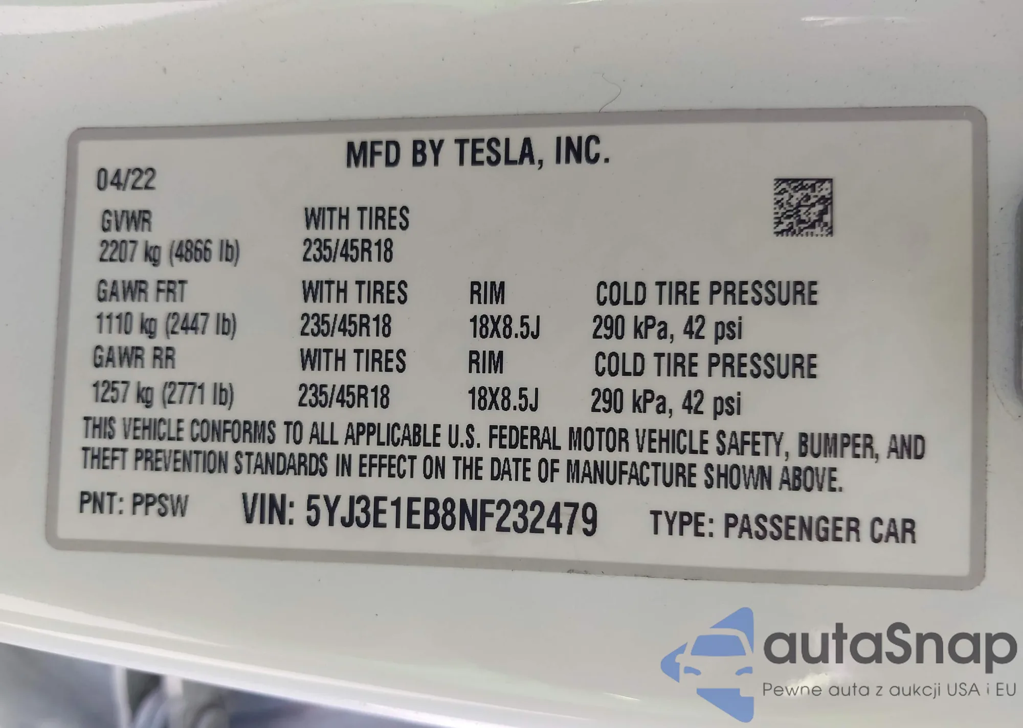 LOT: 42302791 VIN: 5YJ3E1EB8NF232479