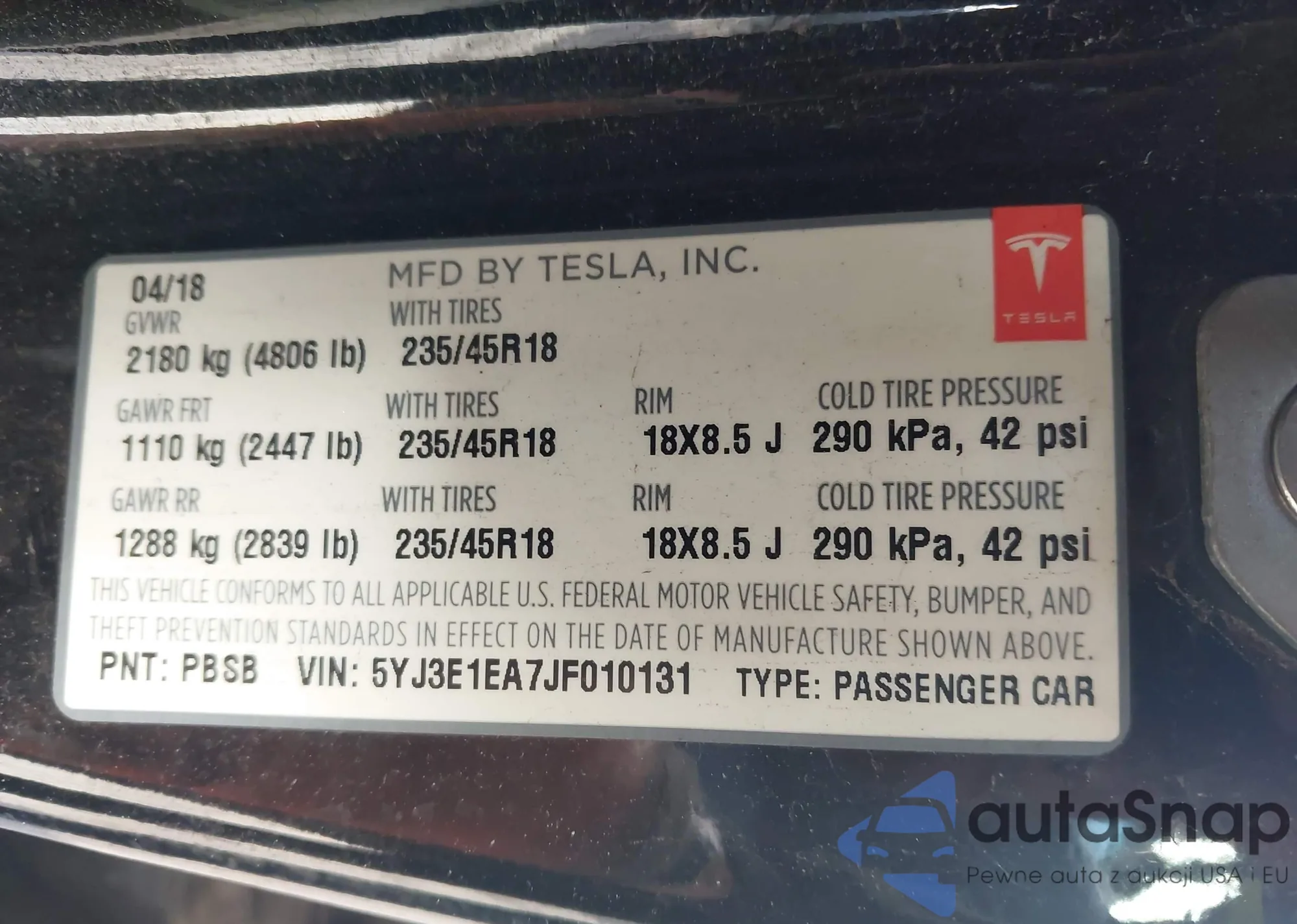 • VIN 5YJ3E1EA7JF010131