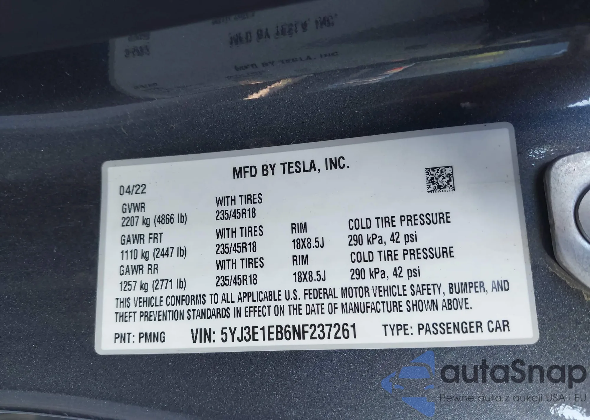 • VIN 5YJ3E1EB6NF237261