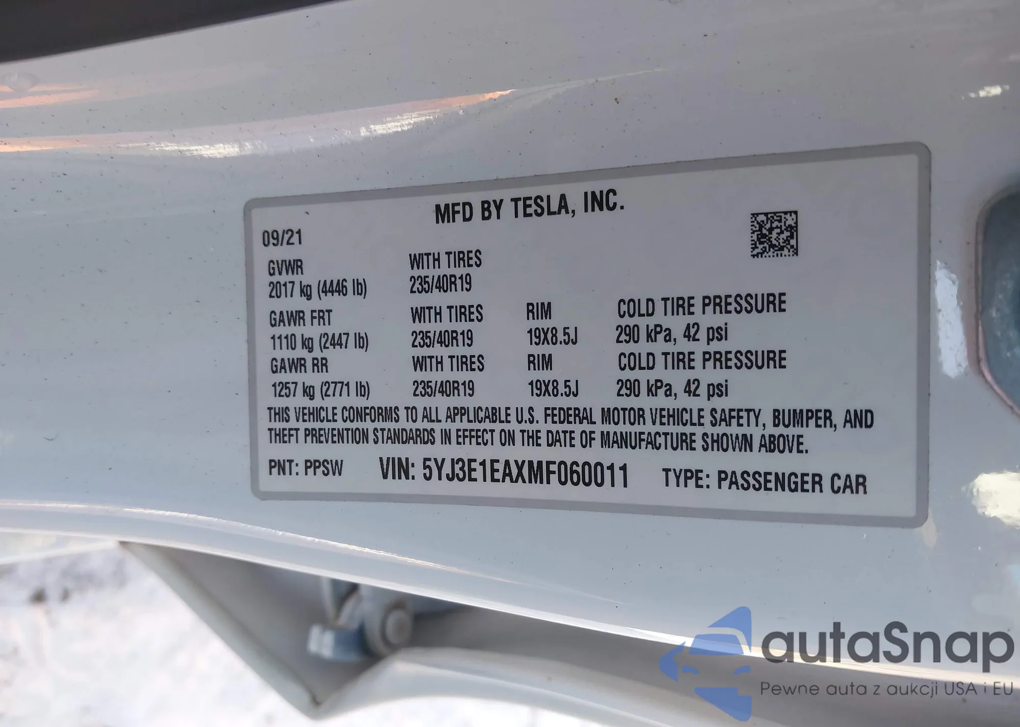 LOT: 43923793 VIN: 5YJ3E1EAXMF060011