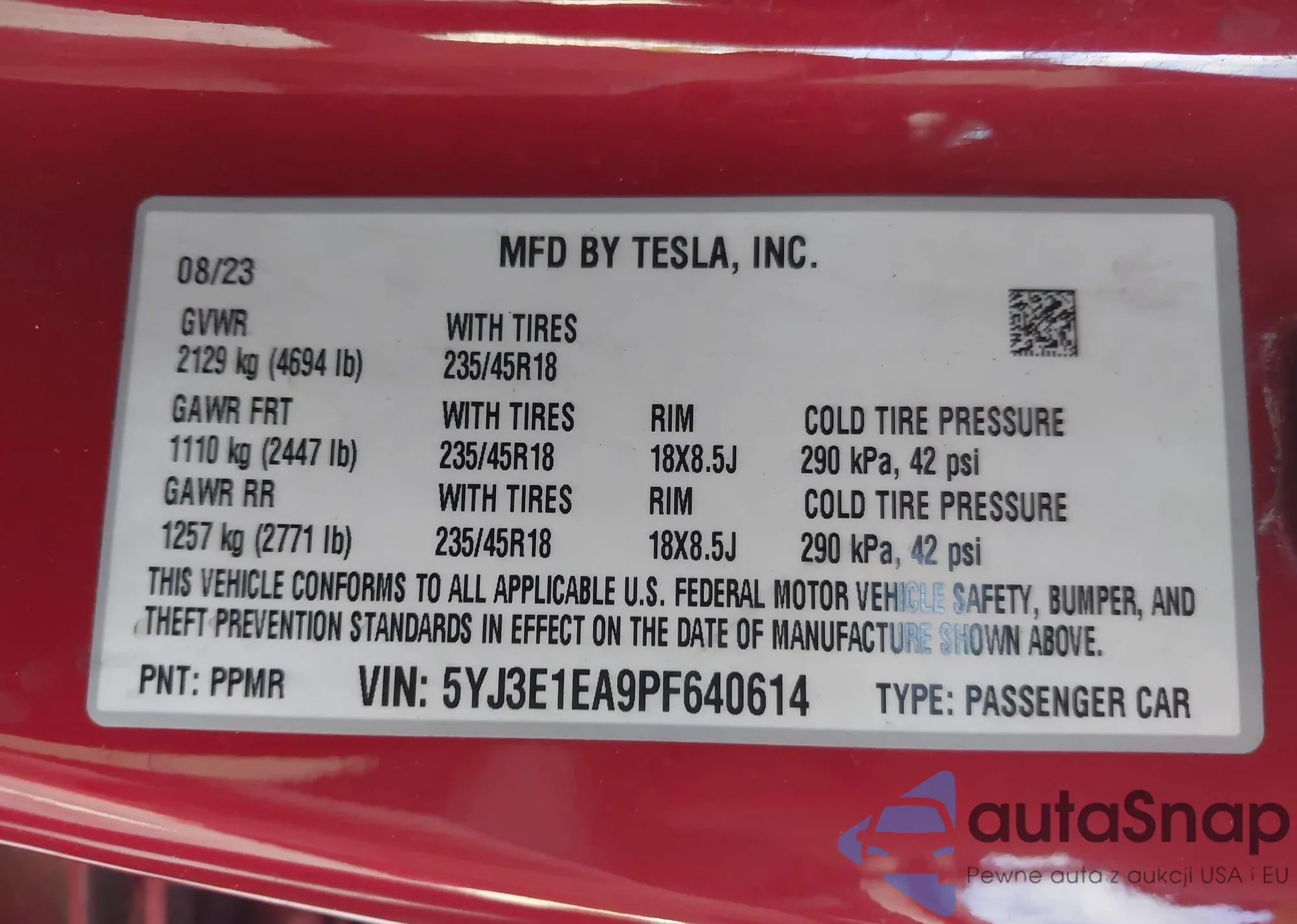 • VIN 5YJ3E1EA9PF640614