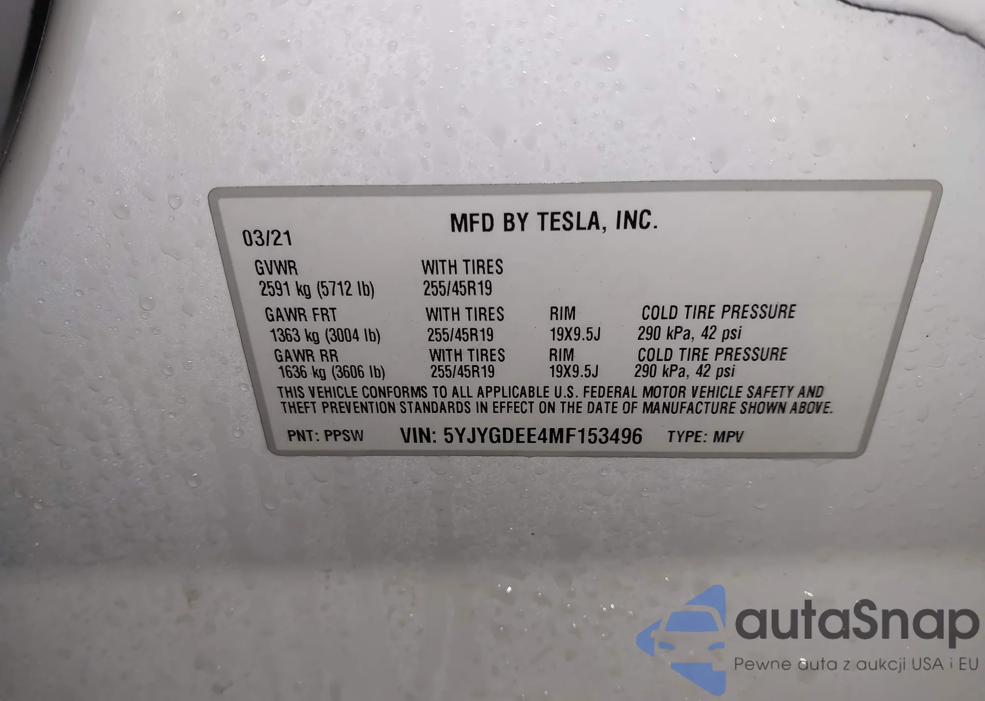 LOT: 95400565 VIN: 5YJYGDEF3MF219982