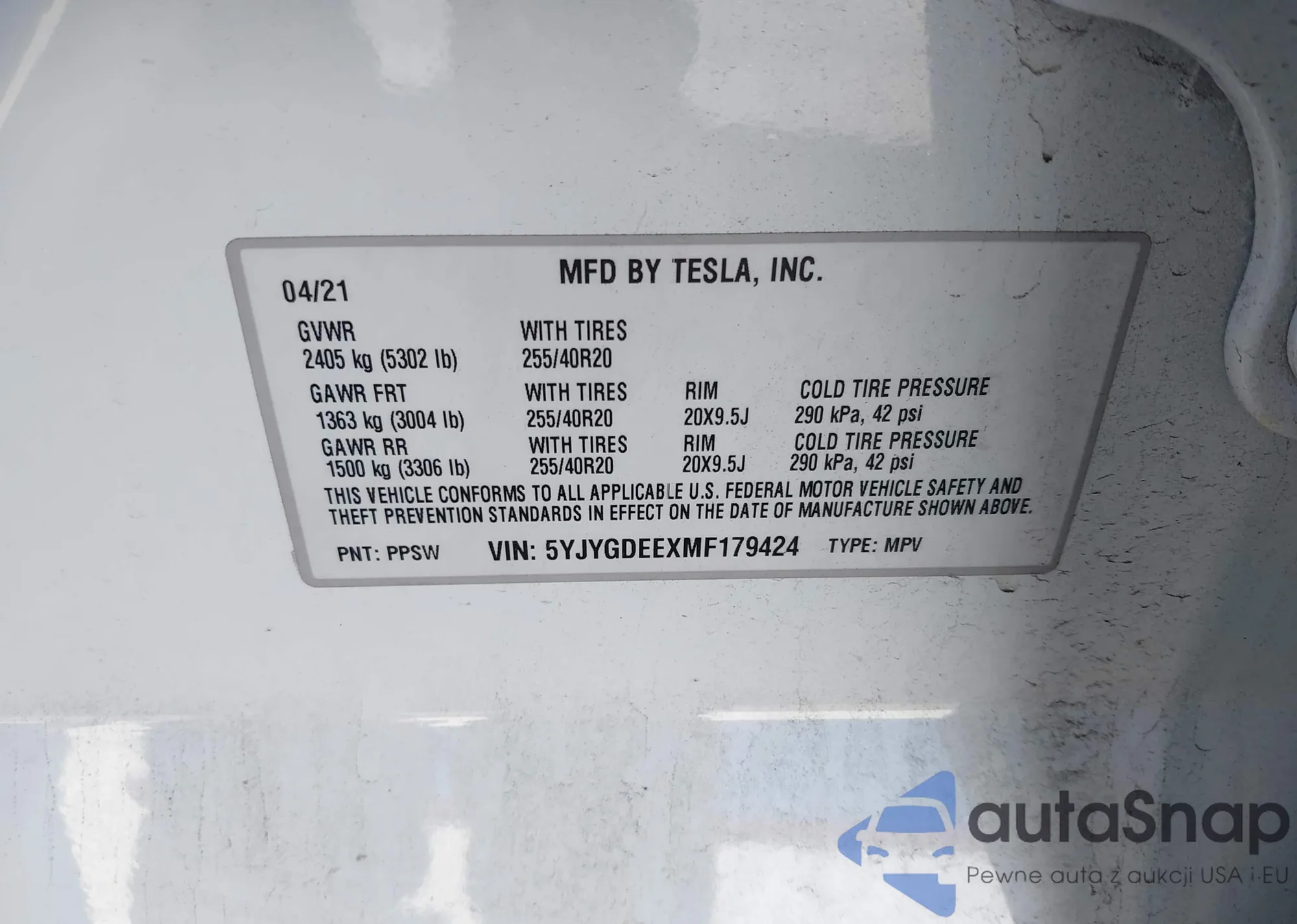 LOT: 43768308 VIN: 5YJYGDEEXMF179424