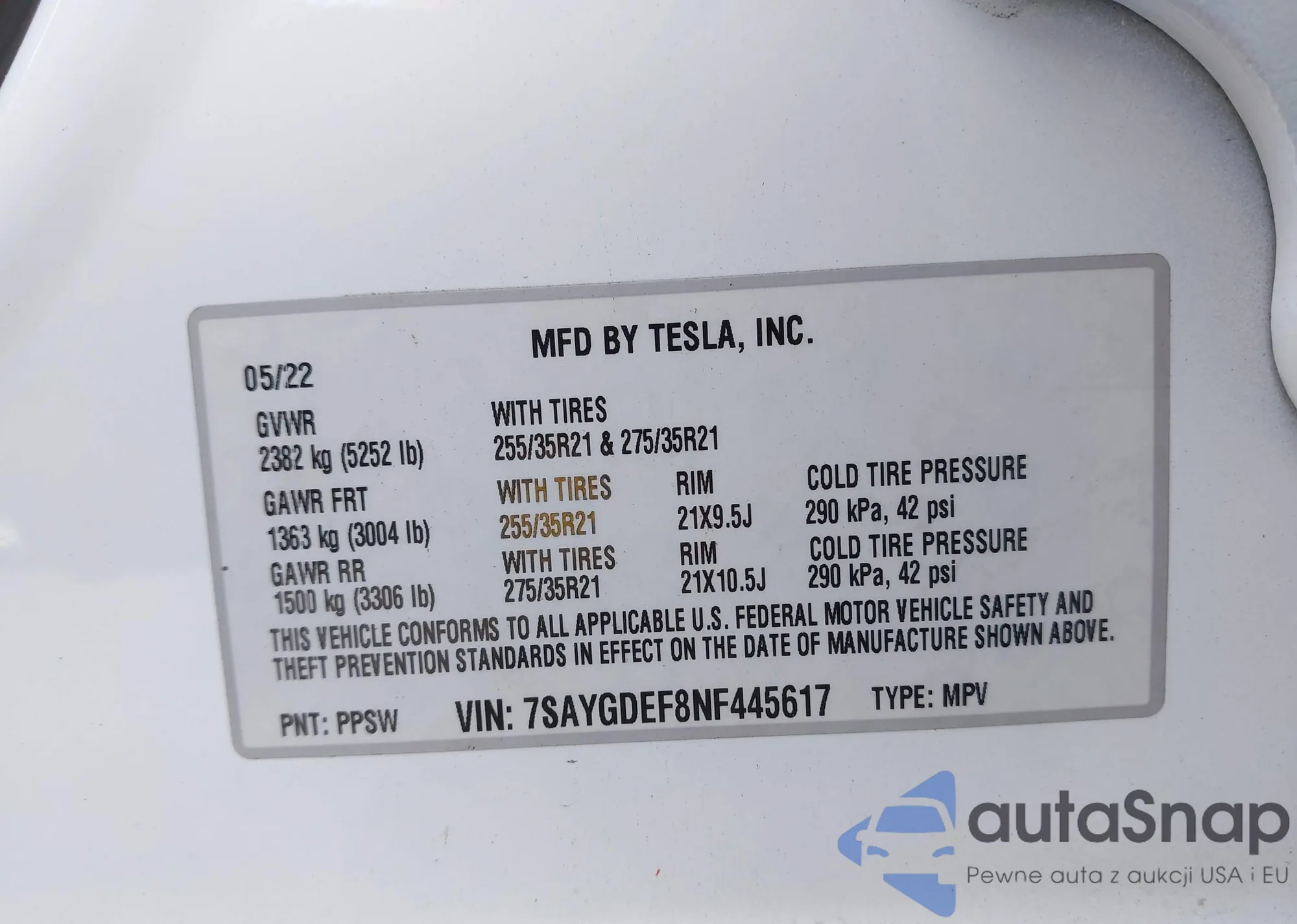 • VIN 7SAYGDEF8NF445617