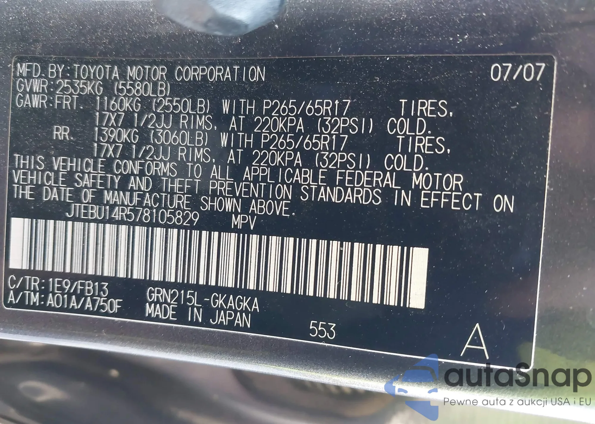 LOT: 44015105 VIN: JTEZU14R378071503