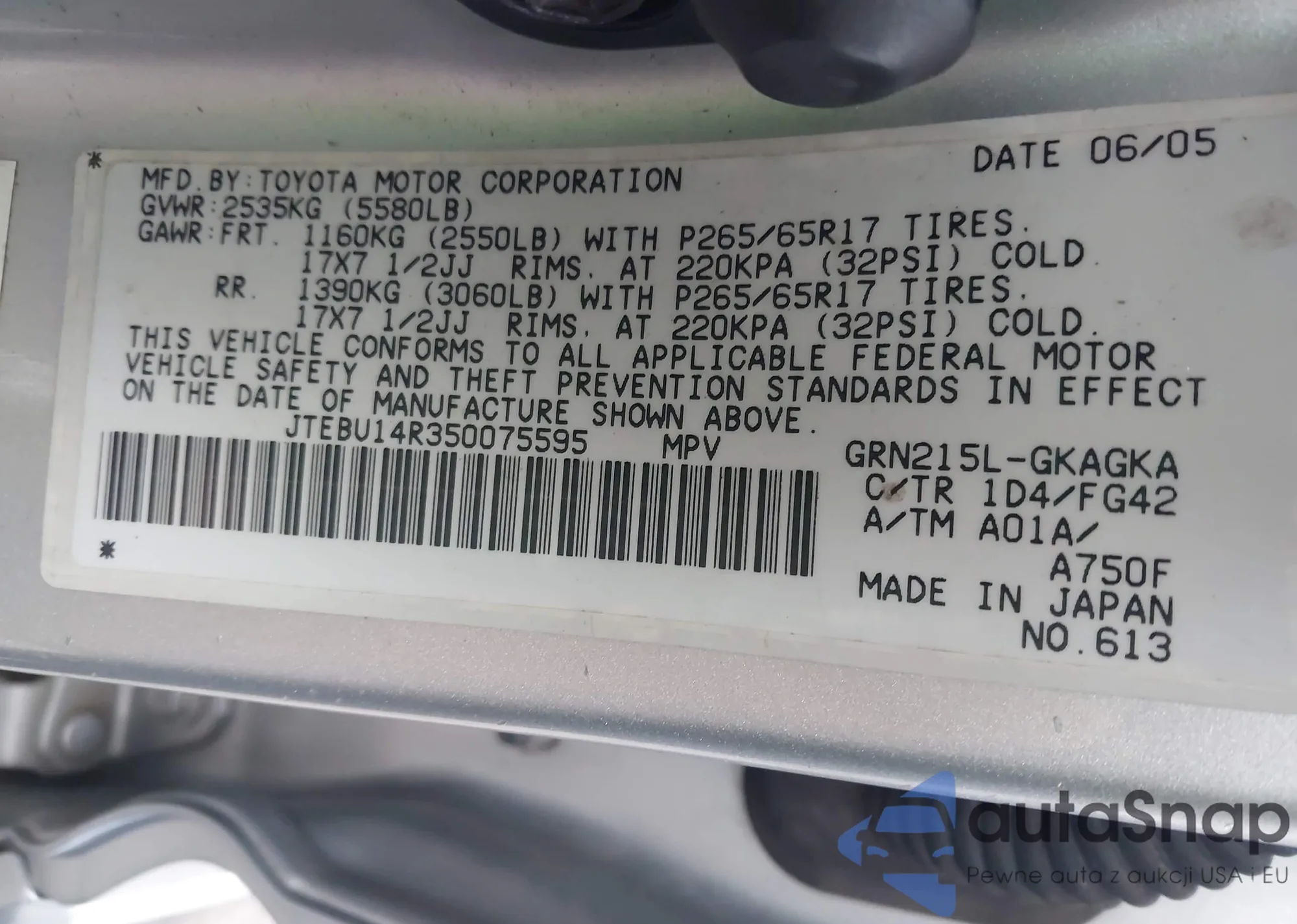 LOT: 44061105 VIN: JTEBU14R350075595