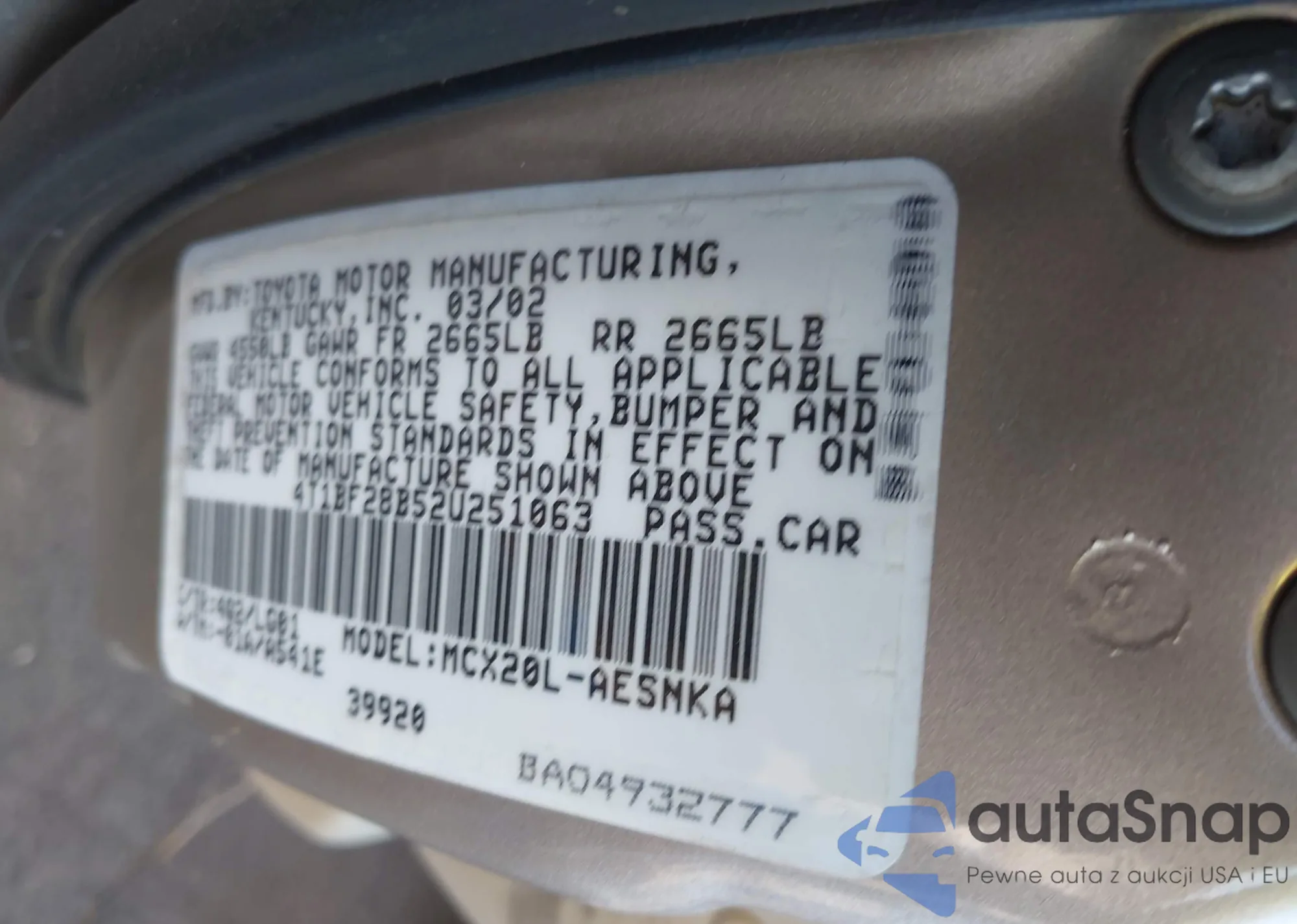 • VIN 4T1BF28BX2U267212