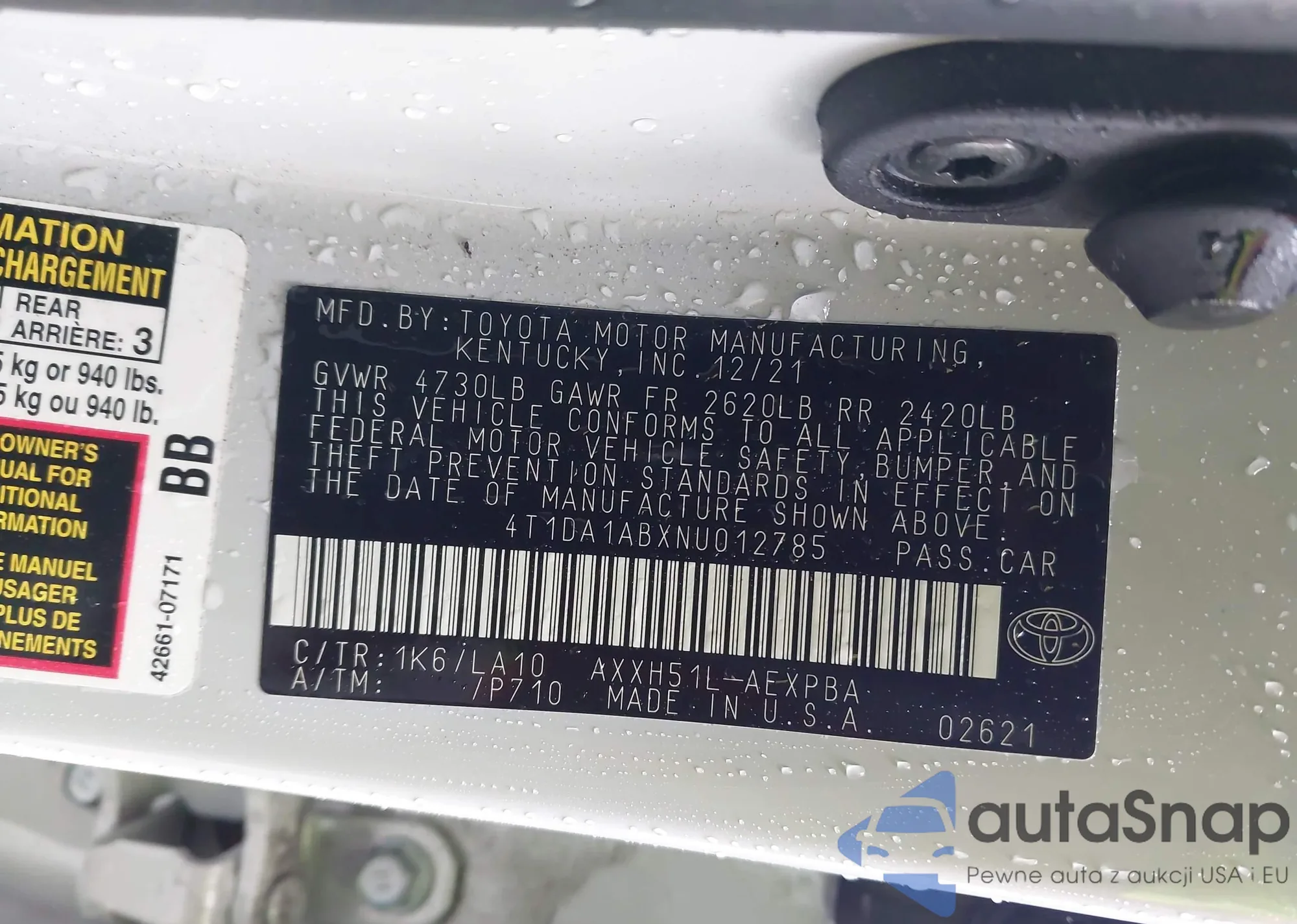 • VIN 4T1DA1ABXNU012785
