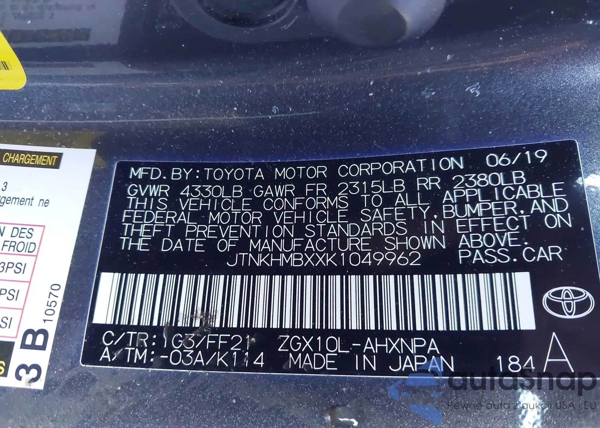 LOT: 44022376 VIN: JTNKHMBX3K1044604