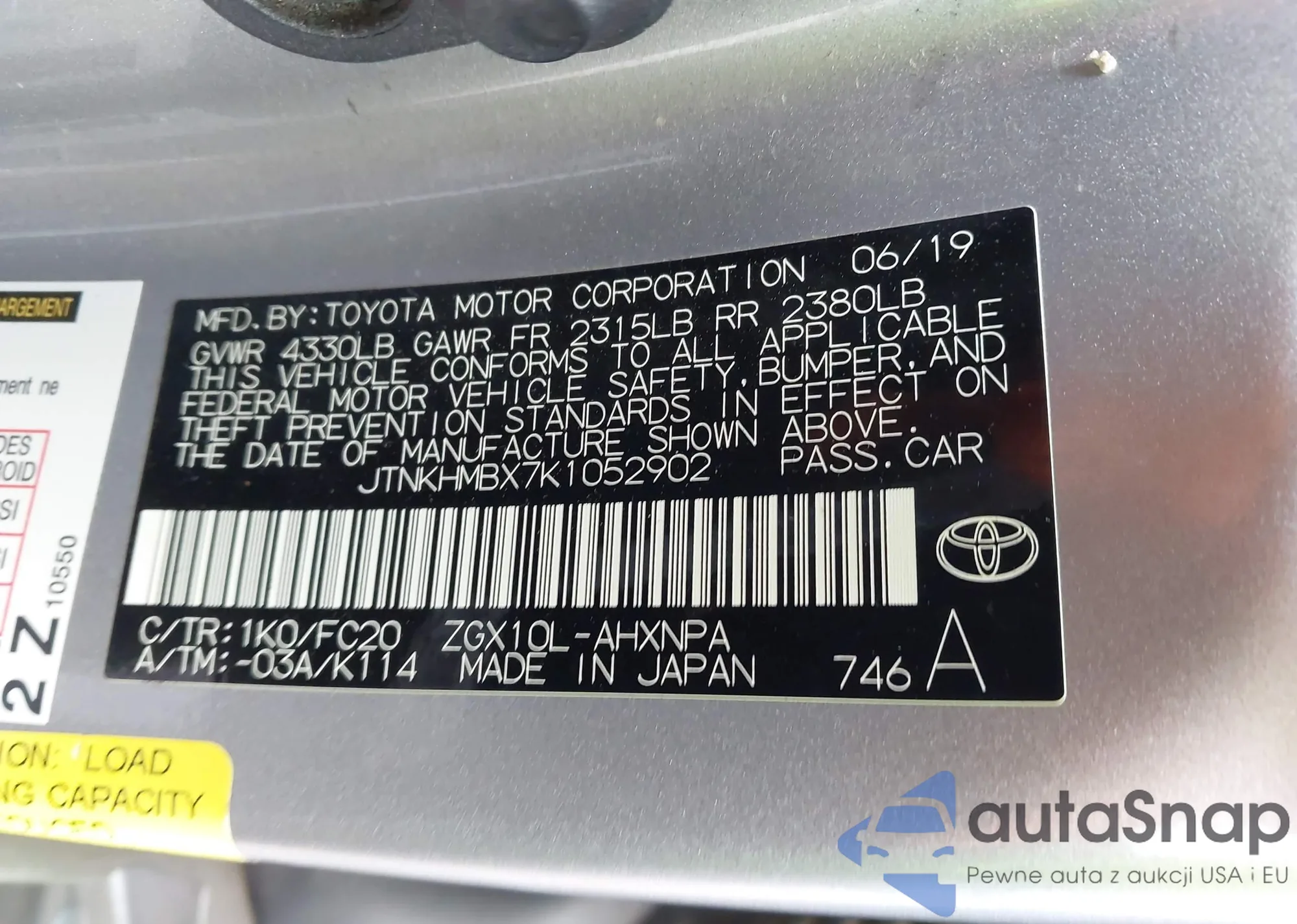 LOT: 43802947 VIN: JTNKHMBX7K1052902