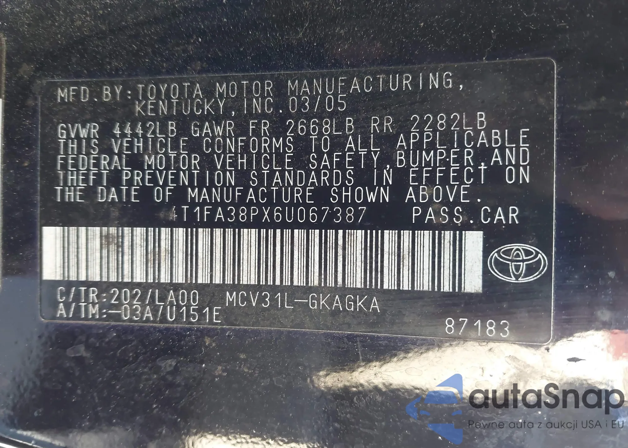 • VIN 4T1FA38PX6U067387