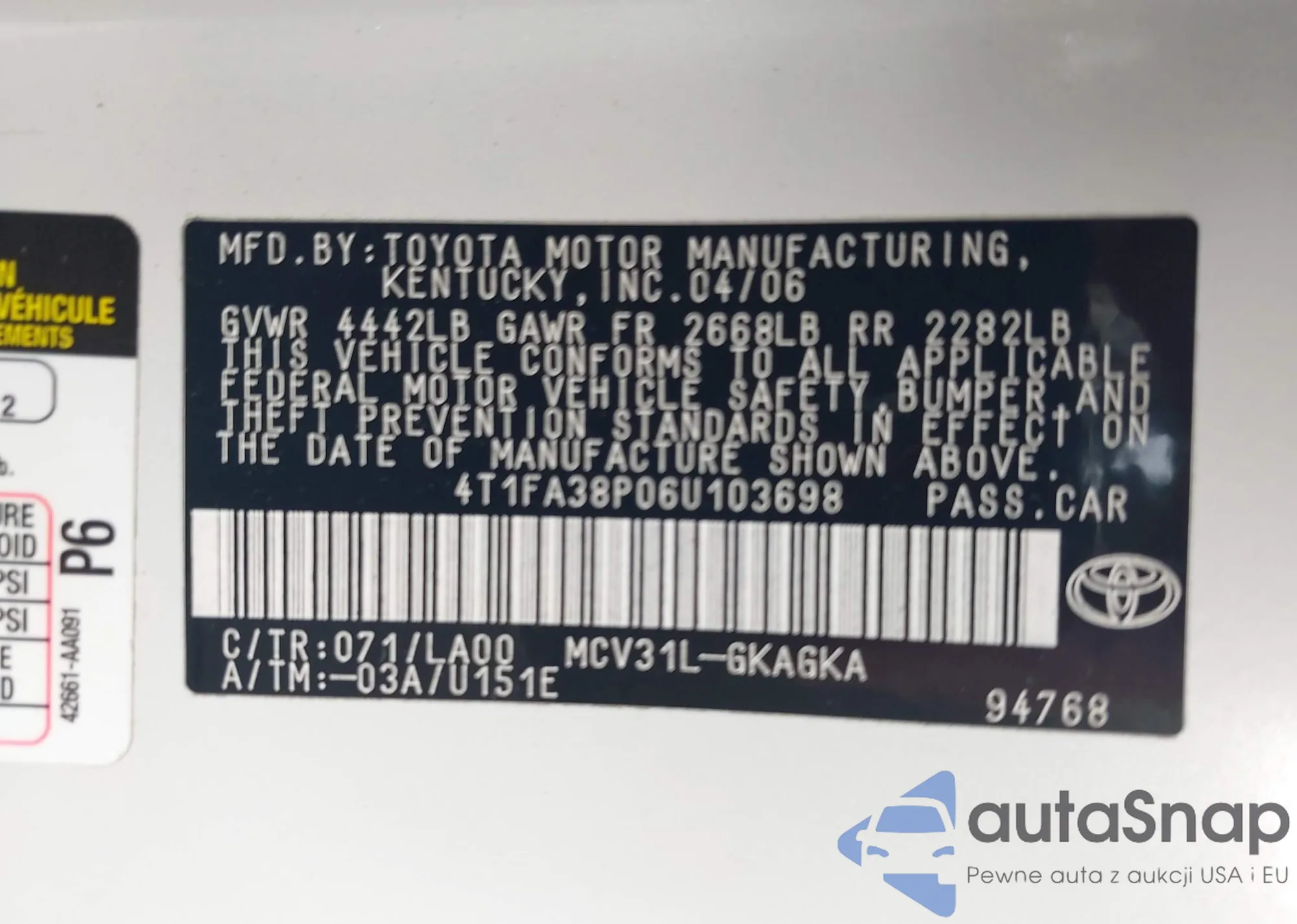 • VIN 4T1FA38P06U103698