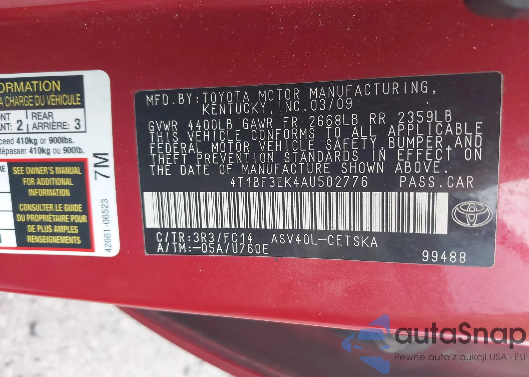 • VIN 4T1BF3EK4AU502776