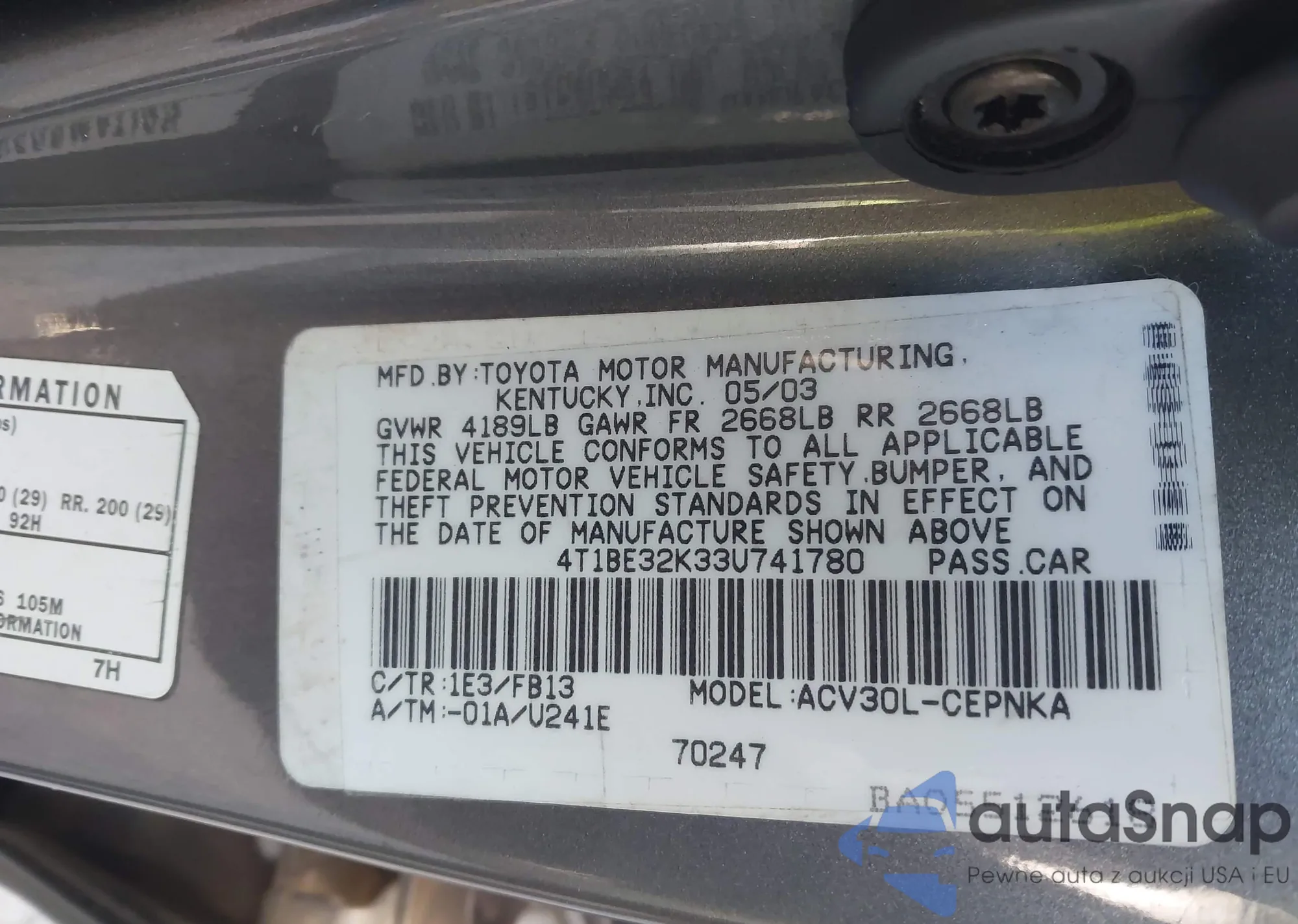 • VIN 4T1BE32K33U741780