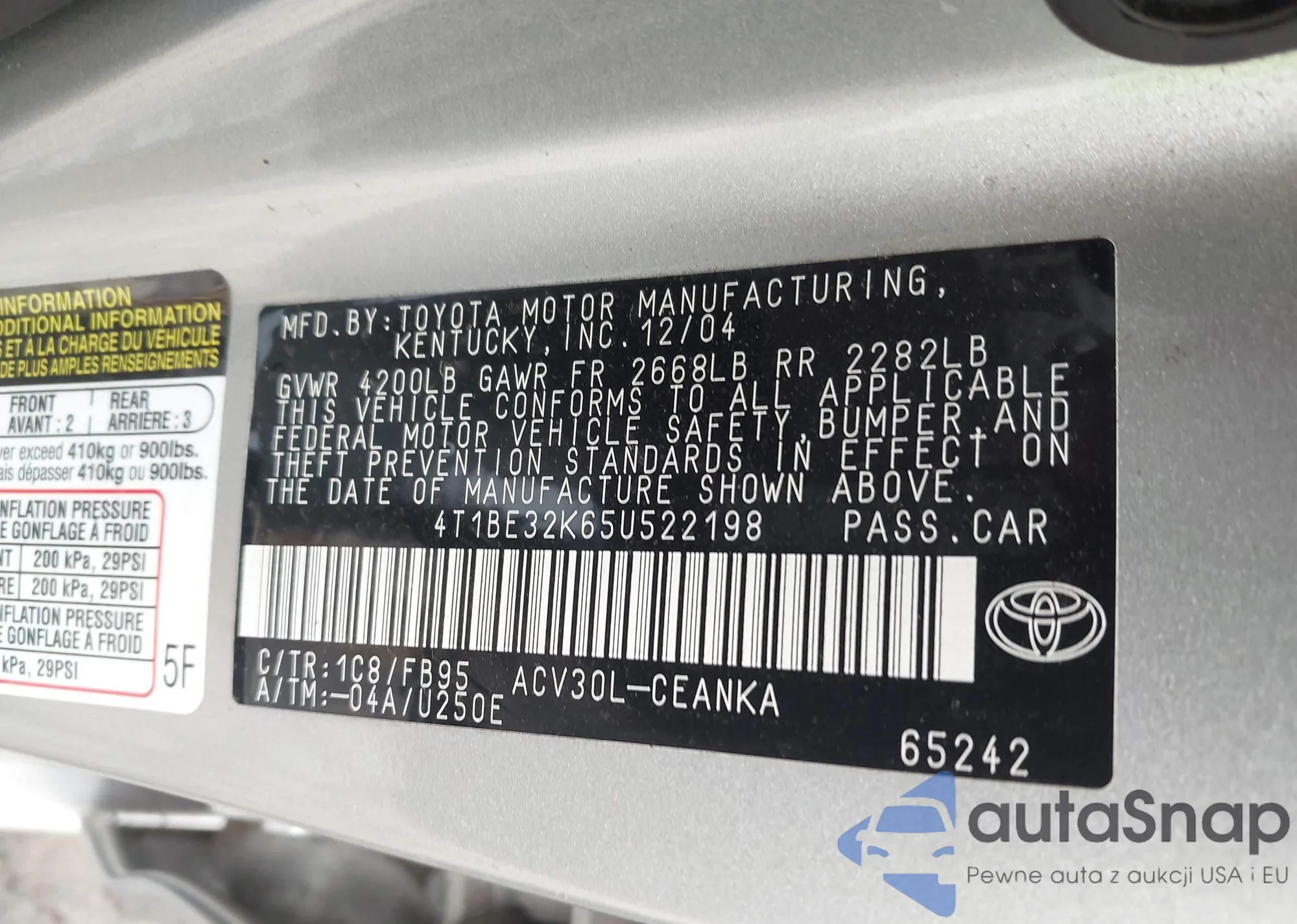 • VIN 4T1BE32K65U522198