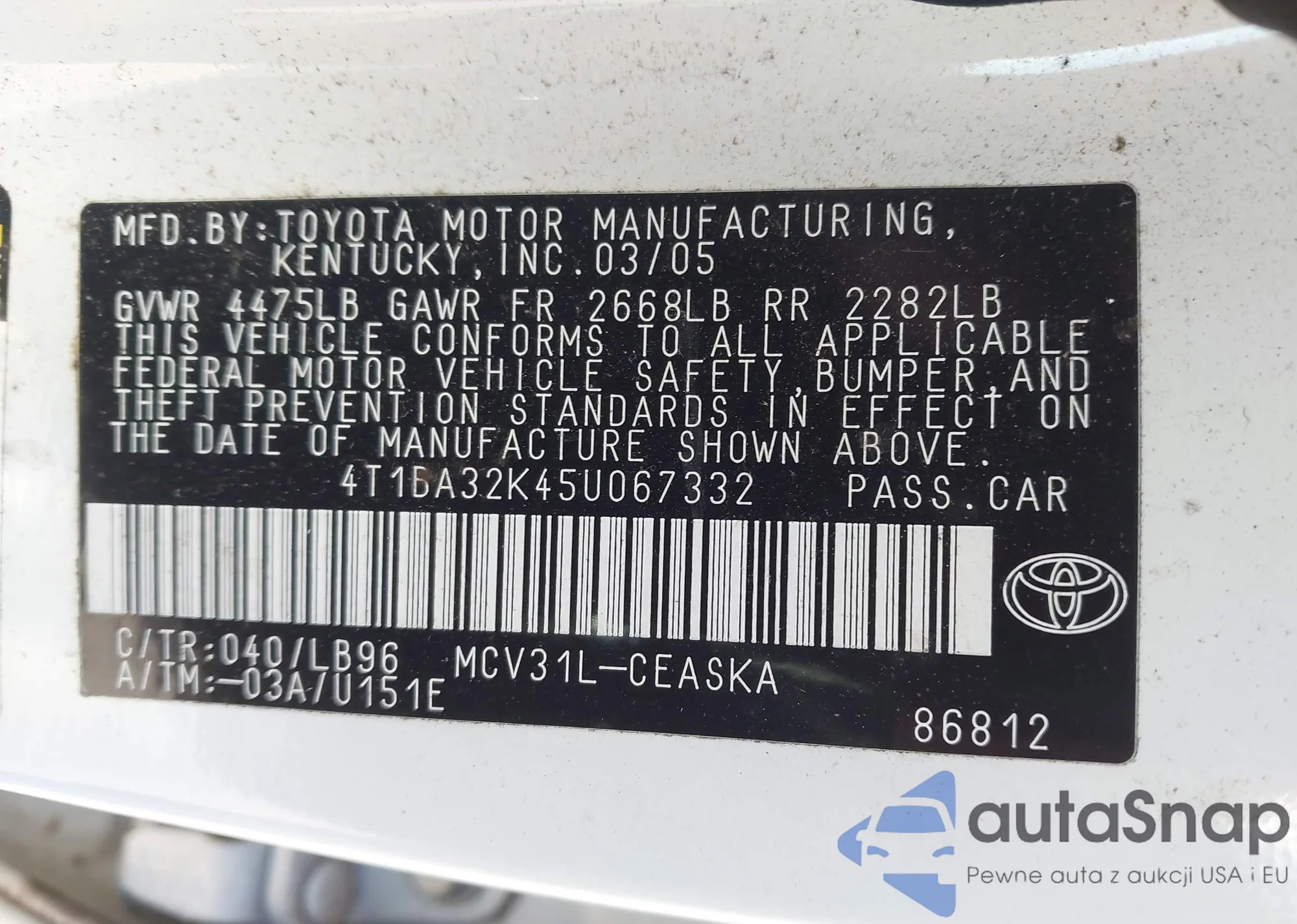 LOT: 44171044 VIN: 4T1BA32K45U067332