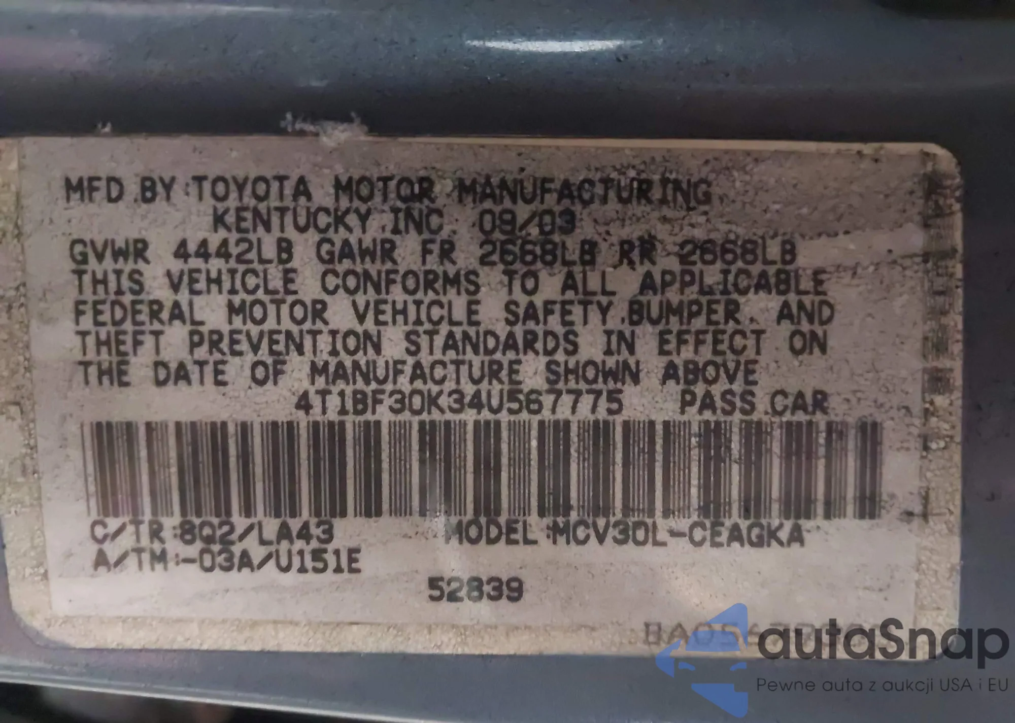 LOT: 44214891 VIN: 4T1BF30K34U567775