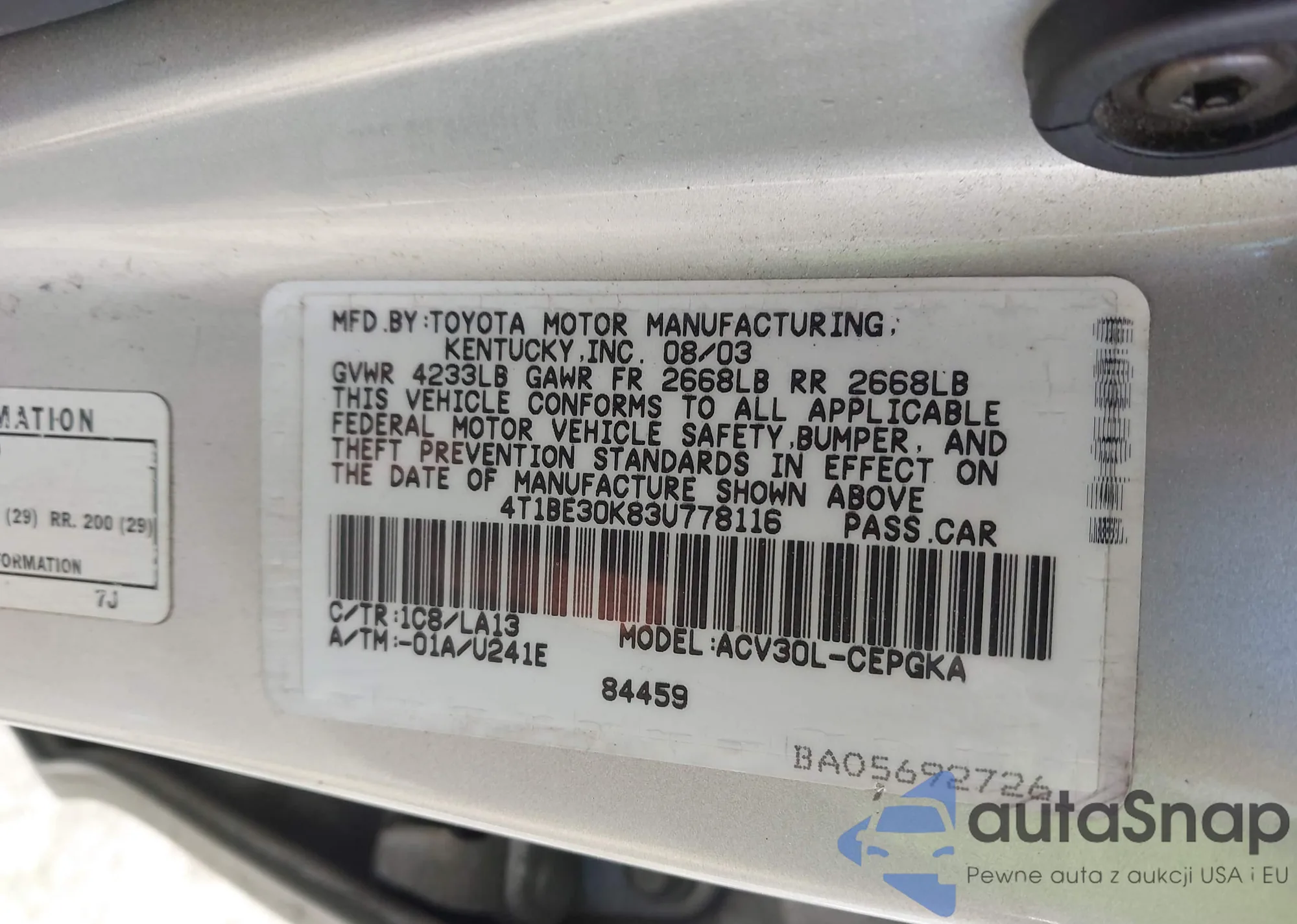 • VIN 4T1BE30K83U778116