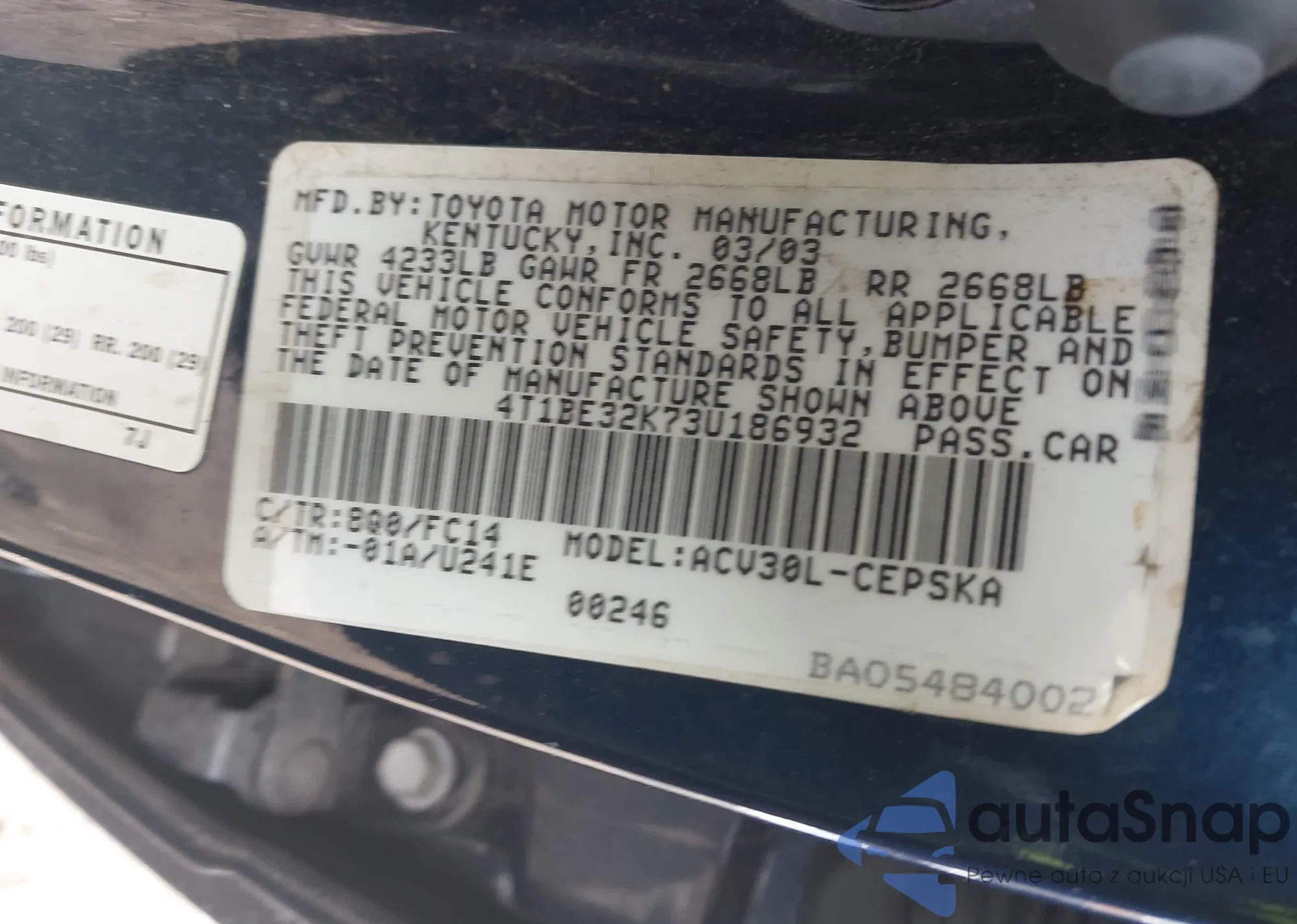 • VIN 4T1BE30K03U222401