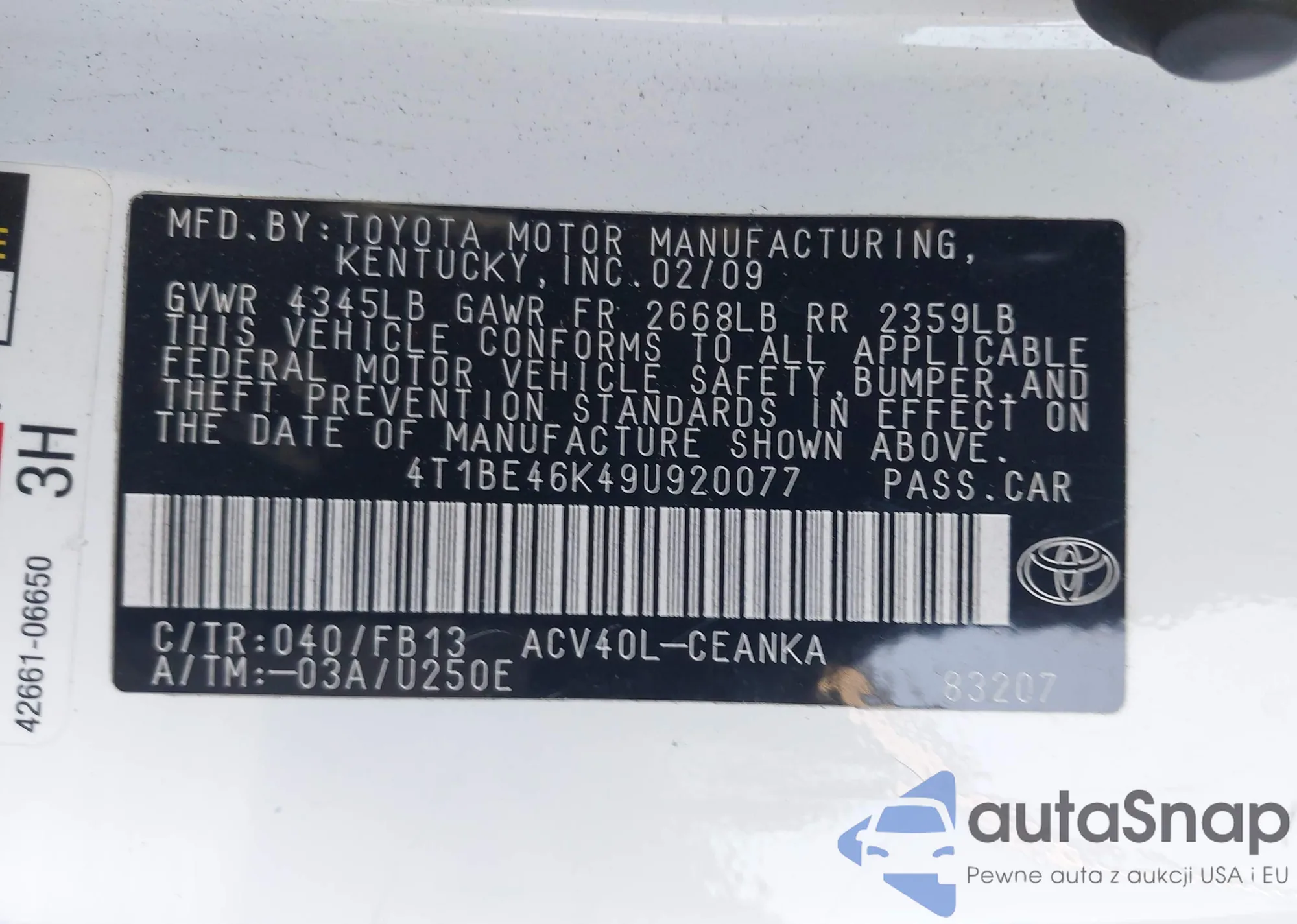 • VIN 4T1BE46K49U920077