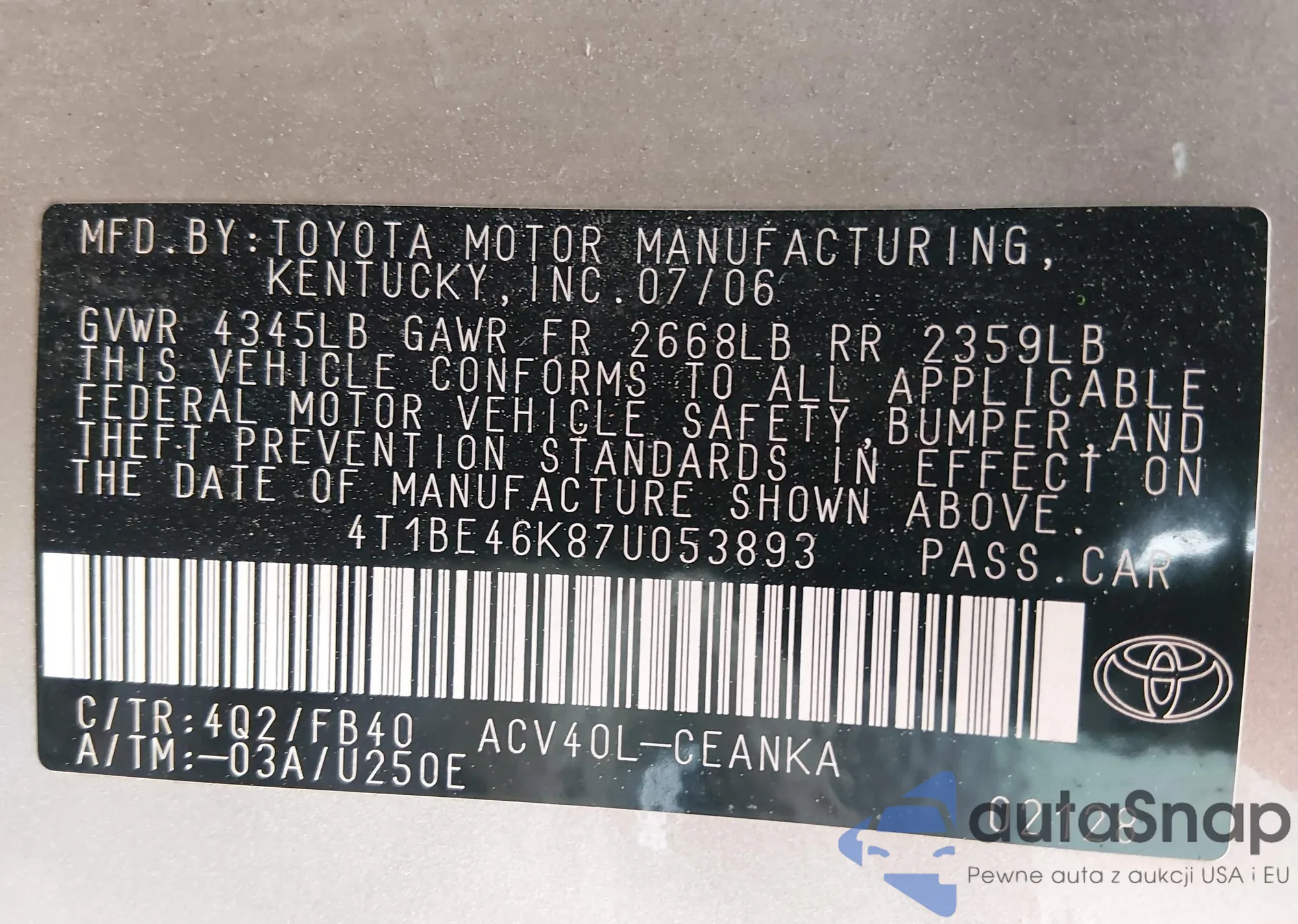 LOT: 44619305 VIN: 4T1BE46K87U053893