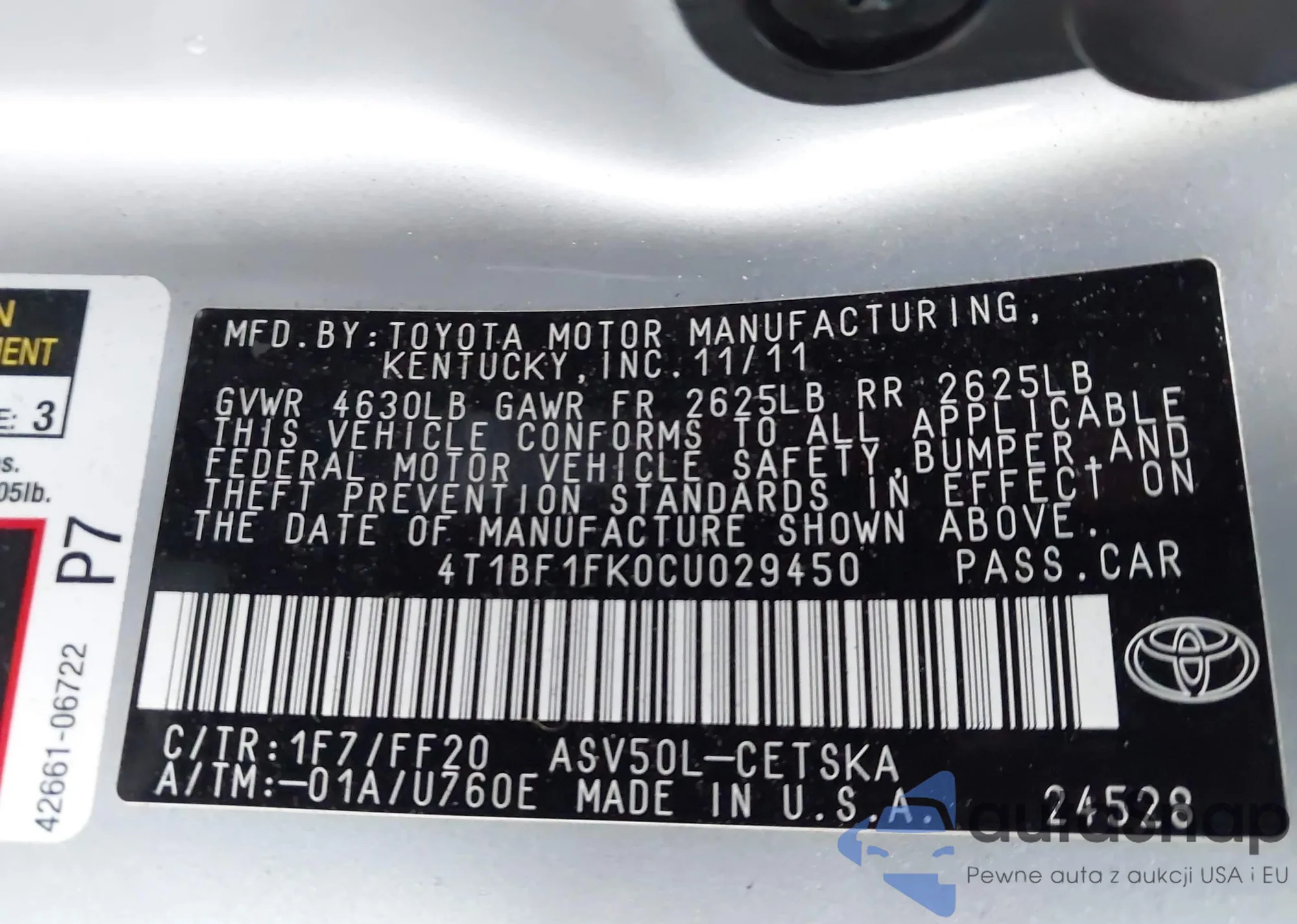 • VIN 4T1BF1FK0CU029450