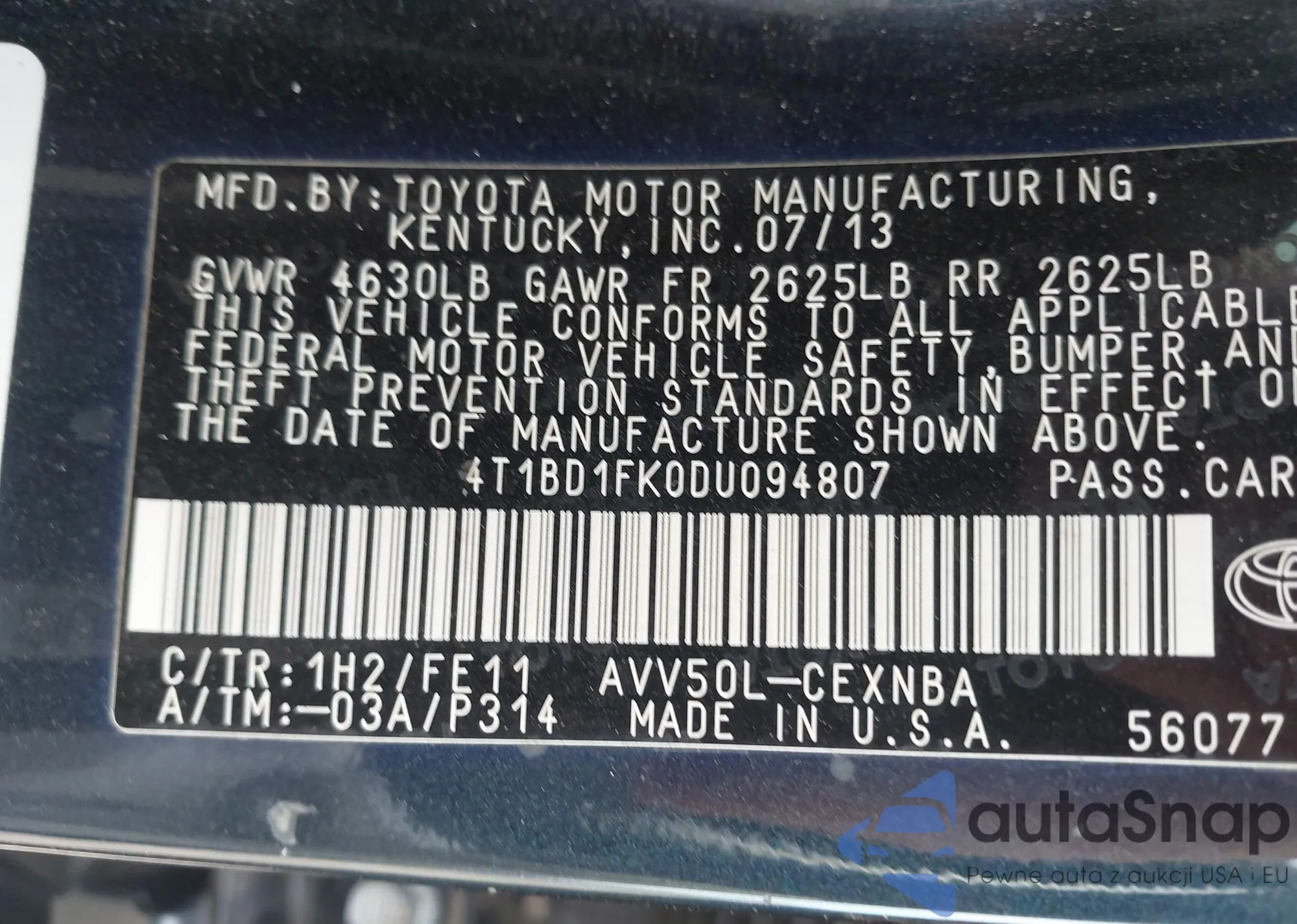 • VIN 4T1BD1FK0DU094807