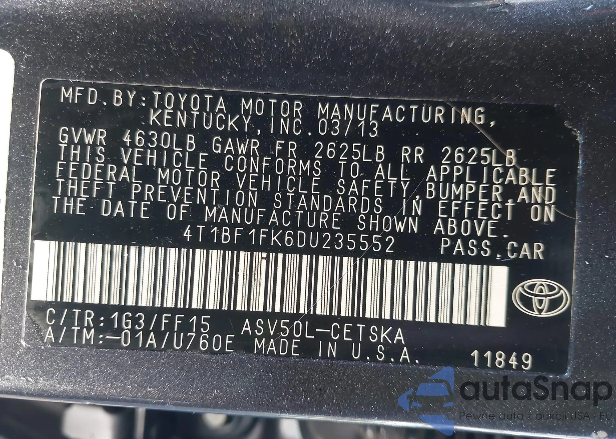 • VIN 4T1BF1FK6DU235552