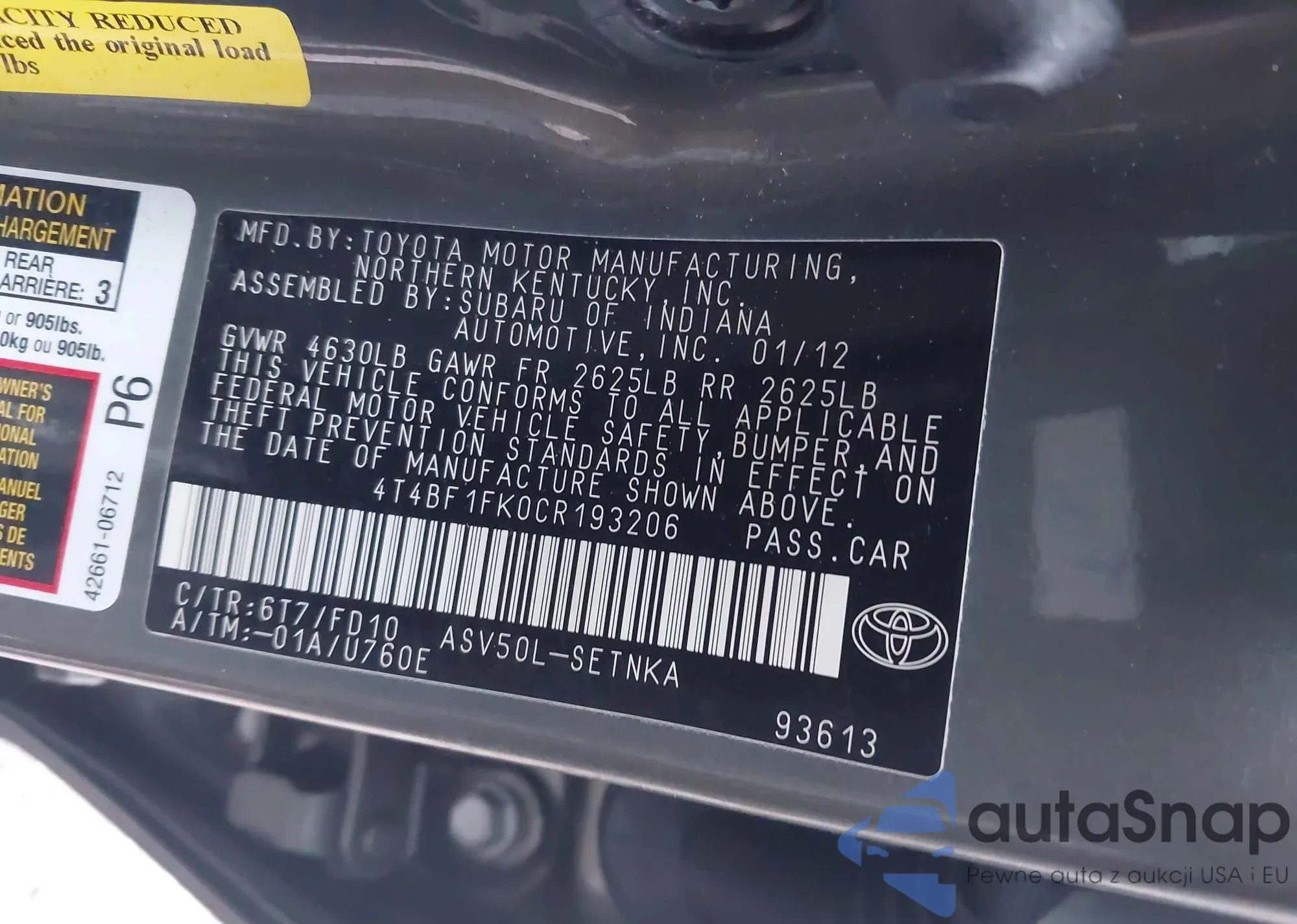 • VIN 4T4BF1FK0CR193206