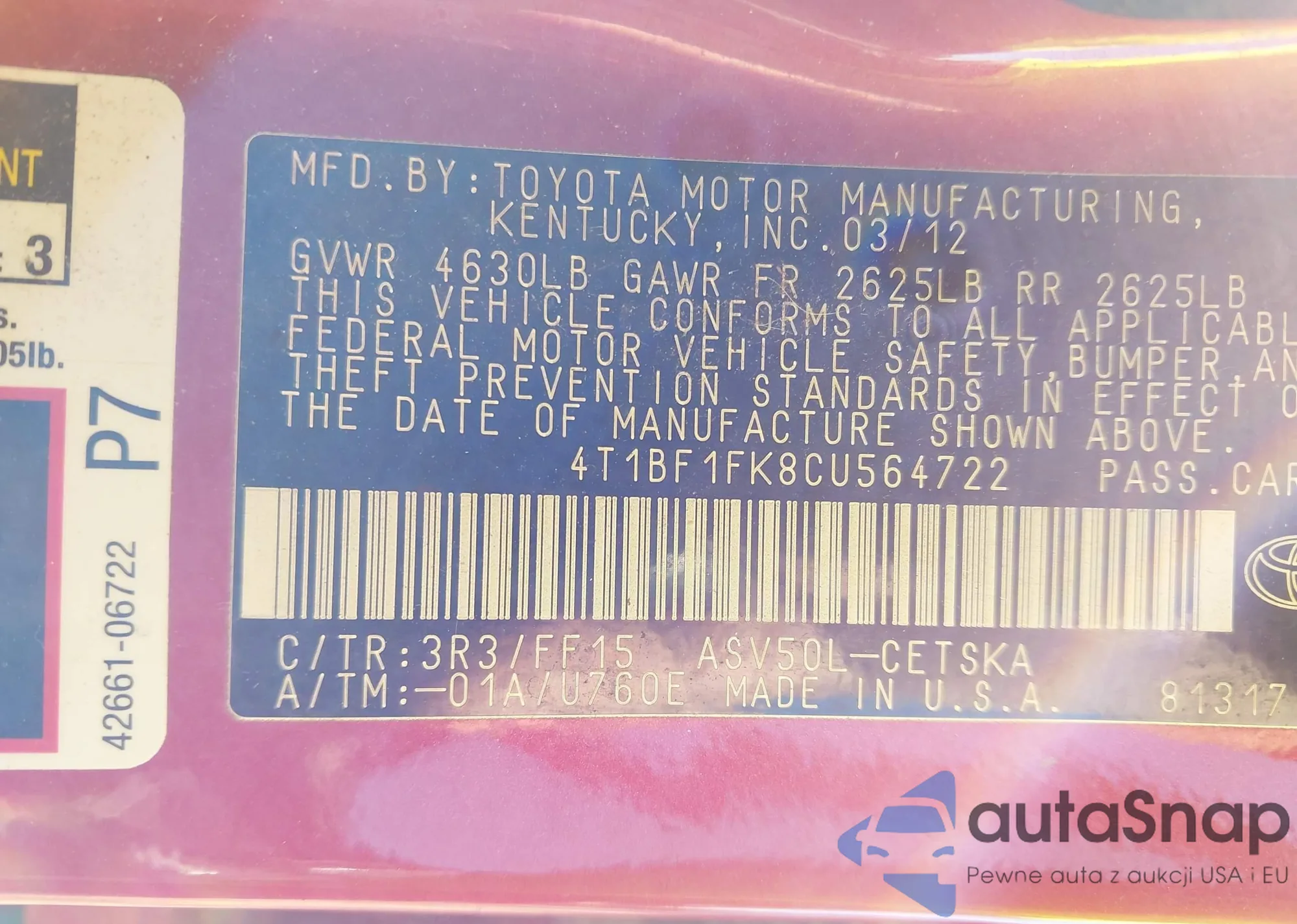 • VIN 4T1BF1FK8CU564722