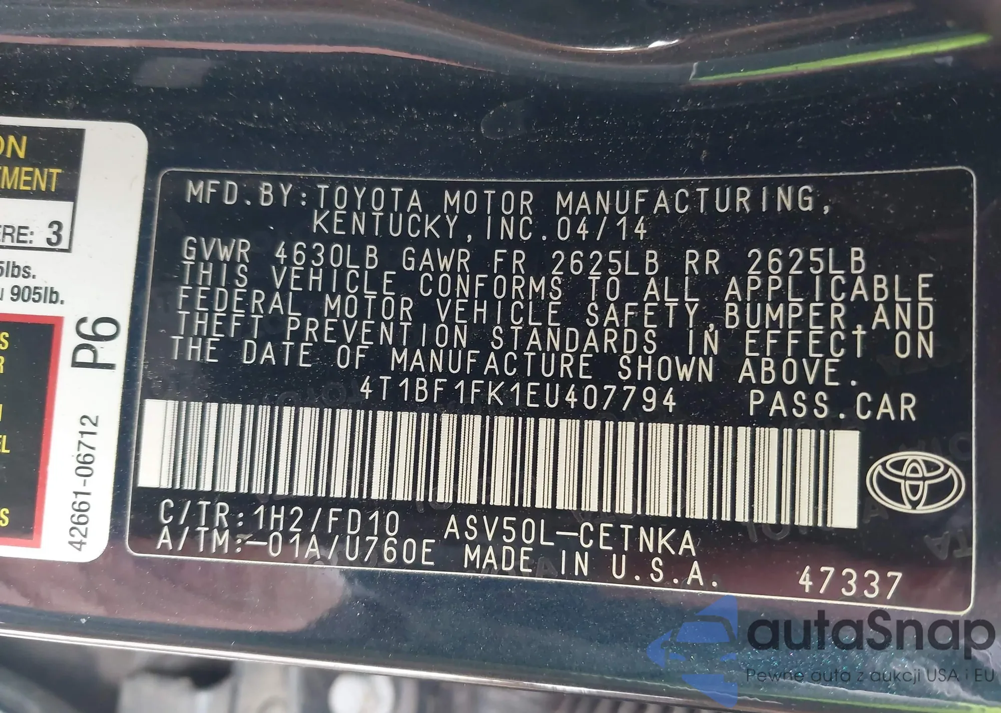 • VIN 4T1BF1FK1EU407794