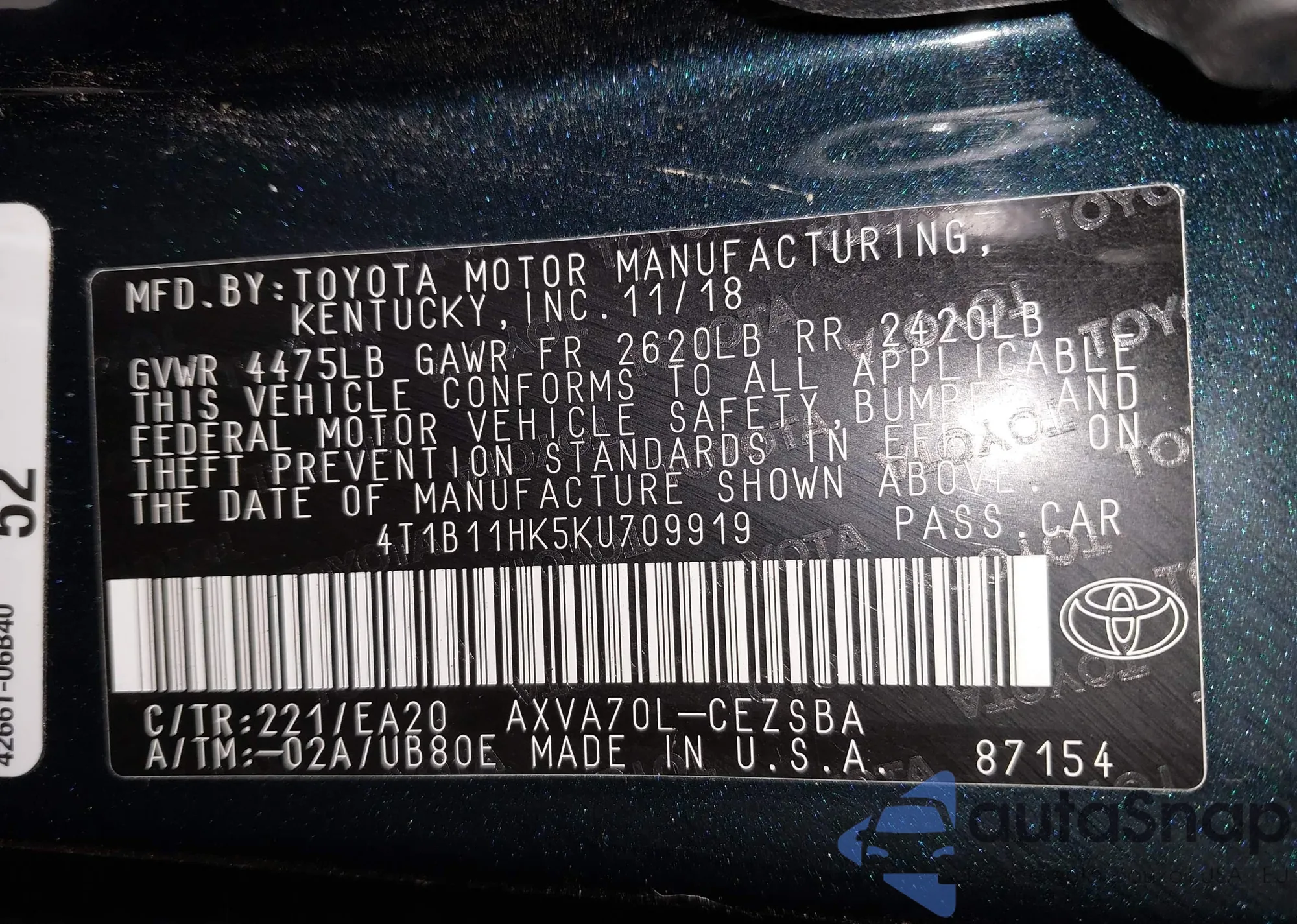 LOT: 44123918 VIN: 4T1B11HKXKU748537