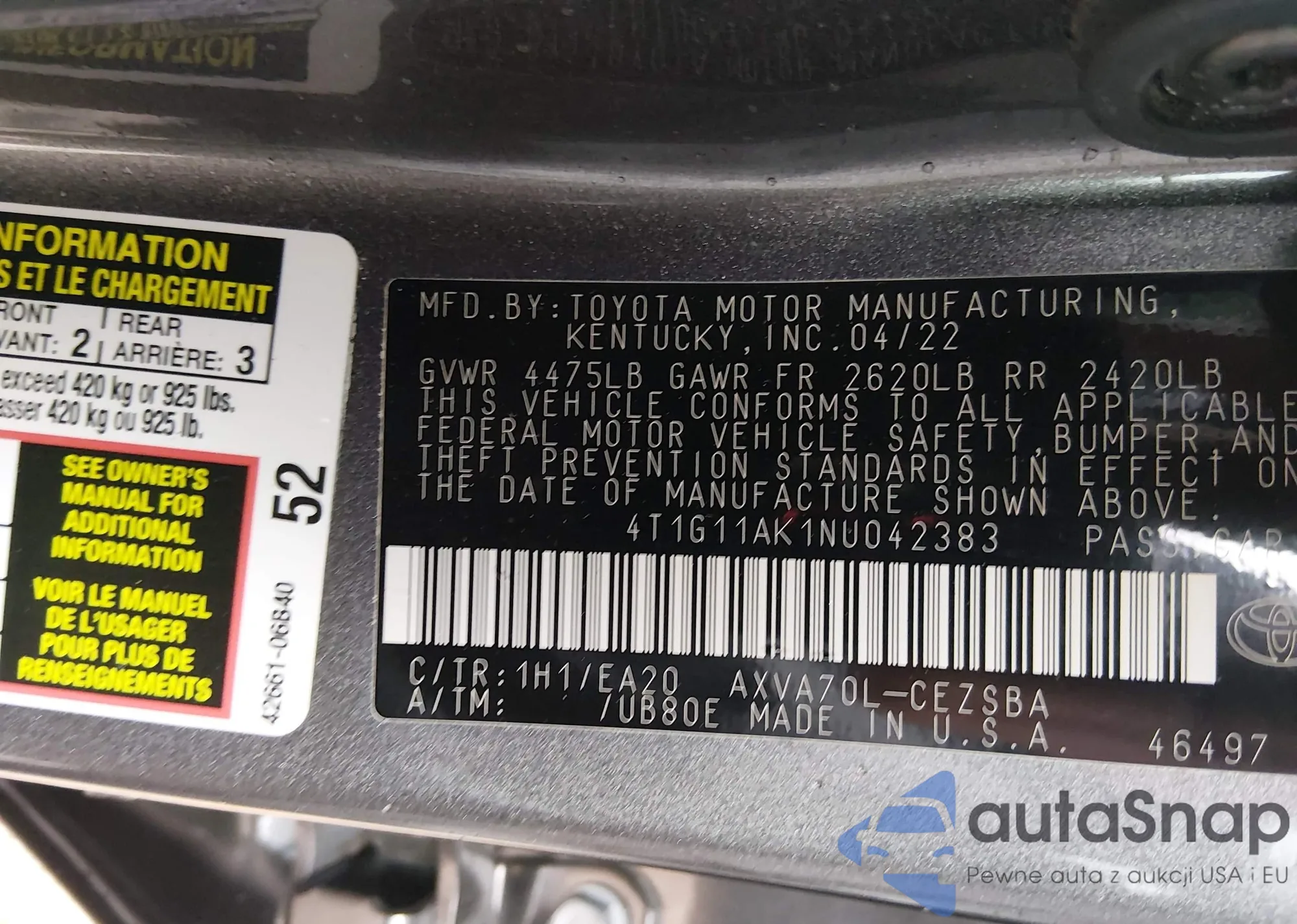 • VIN 4T1G11AK1NU042383