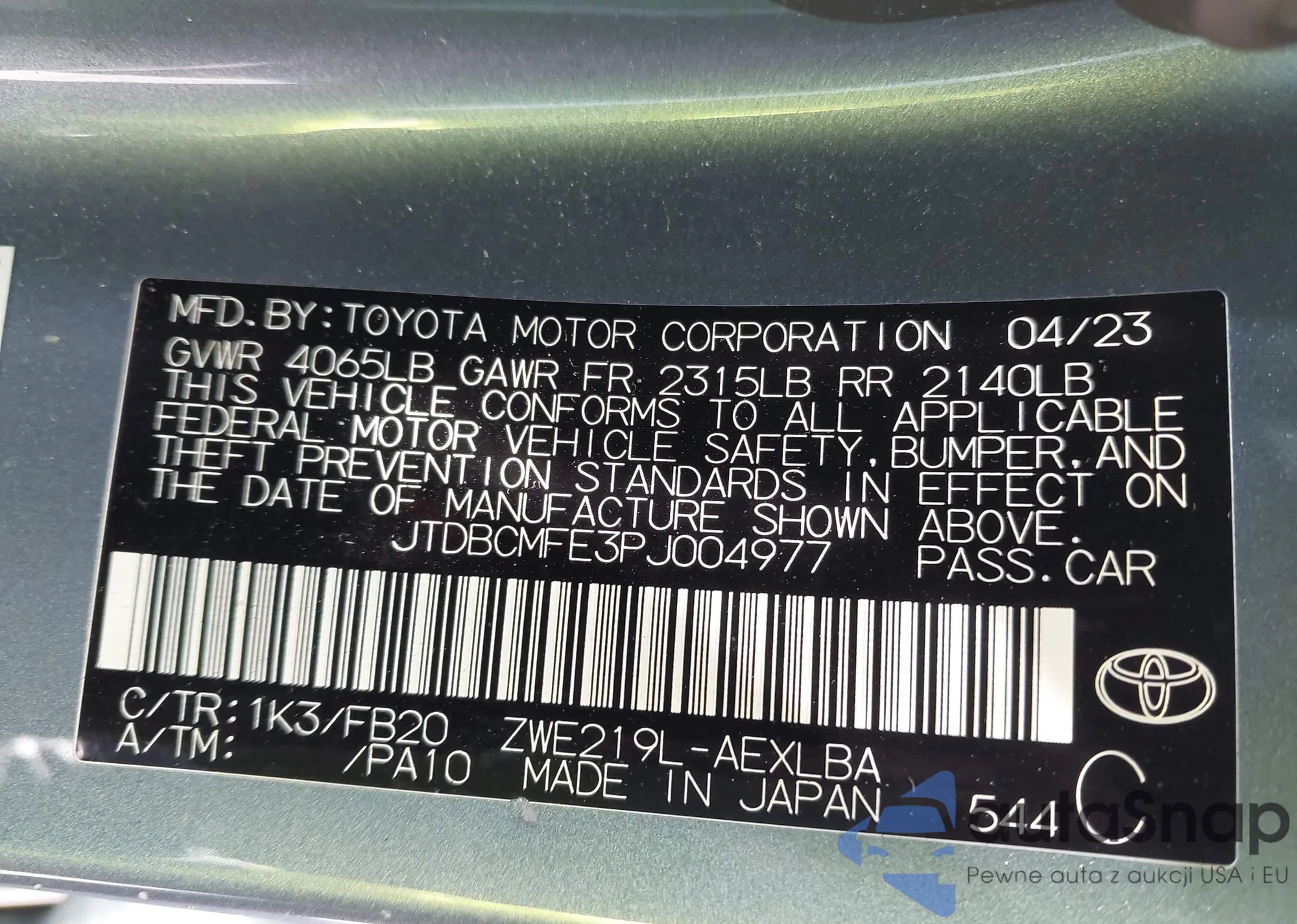 LOT: 44076053 VIN: JTDBCMFE3PJ004977