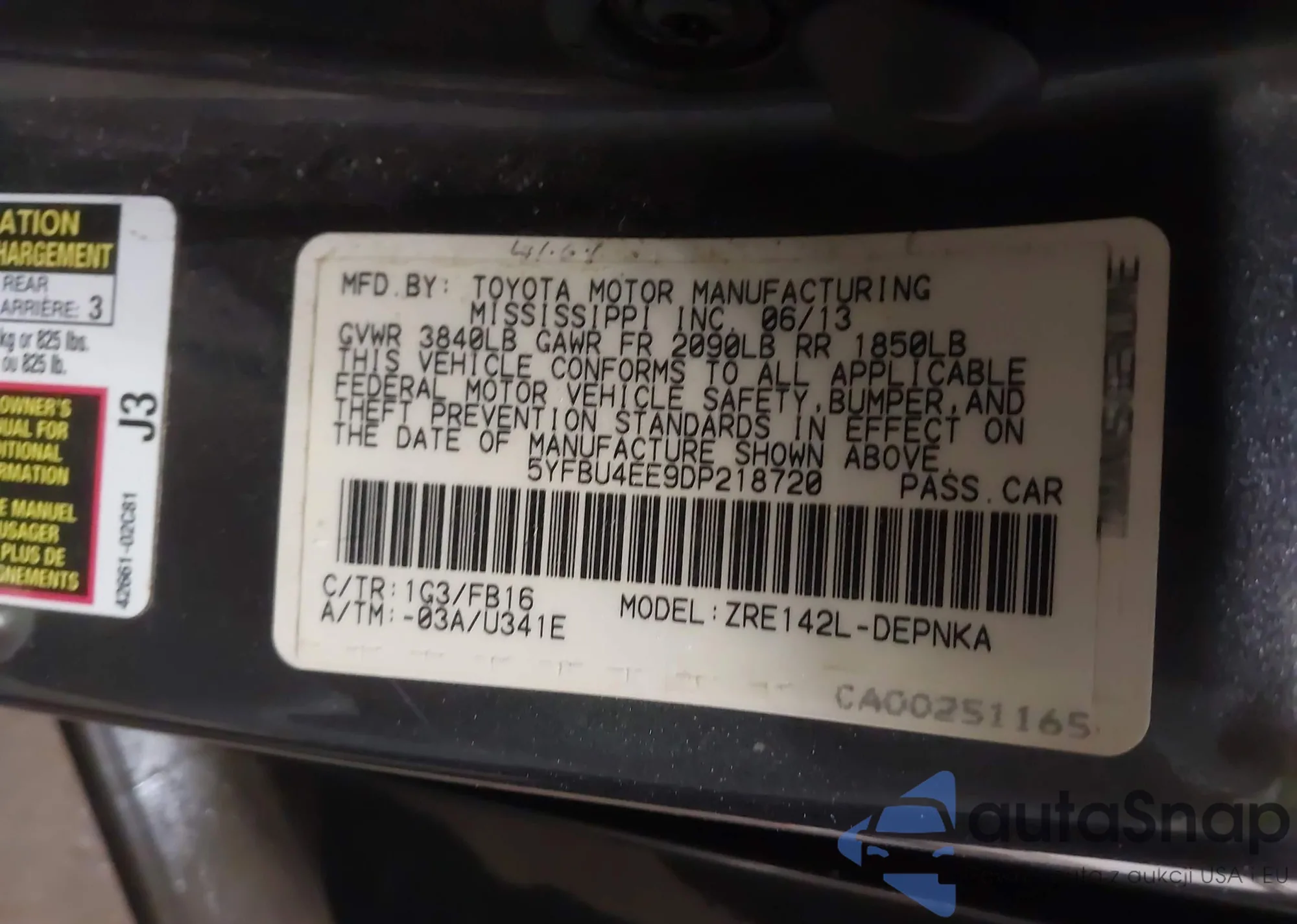 LOT: 43807343 VIN: 5YFBU4EE9DP218720