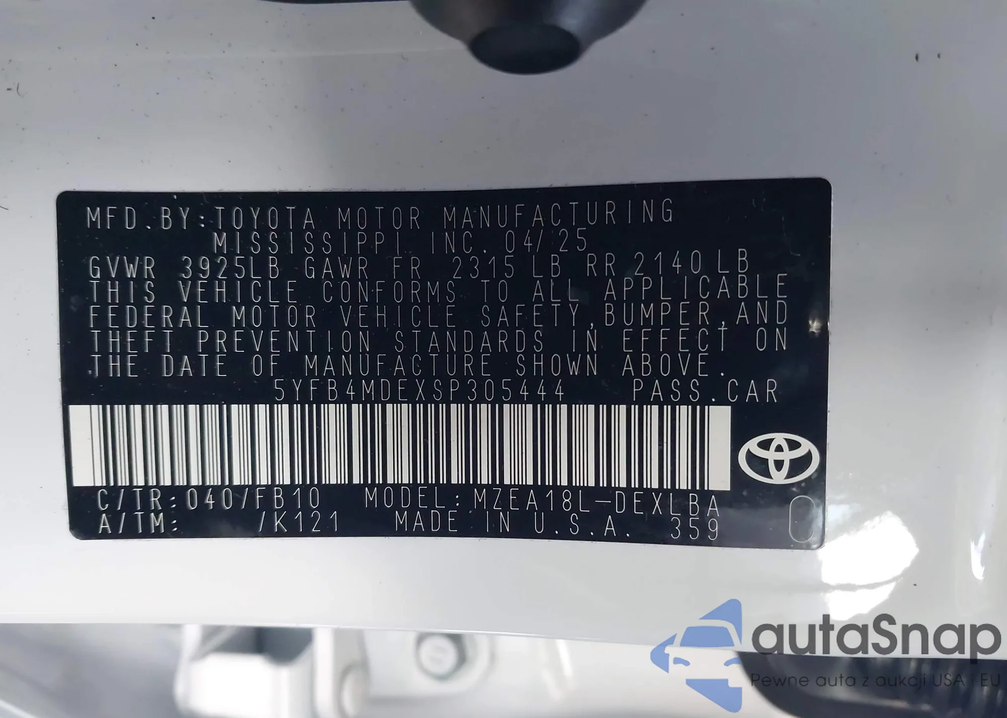 • VIN 5YFB4MDEXSP305444