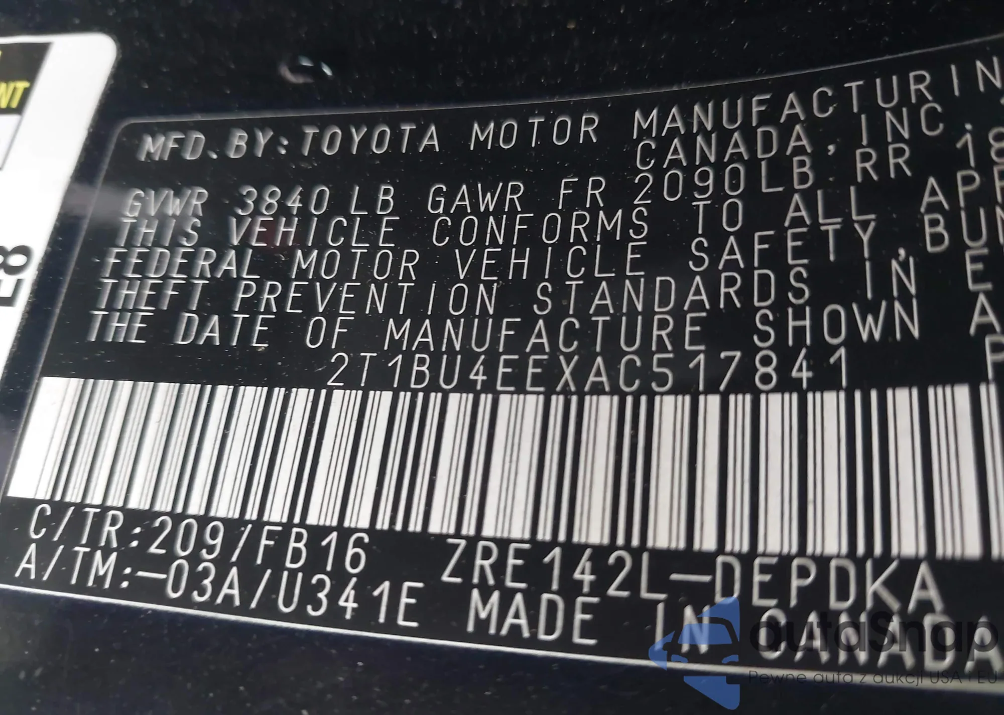 LOT: 44528274 VIN: 1NXBU4EE9AZ317564