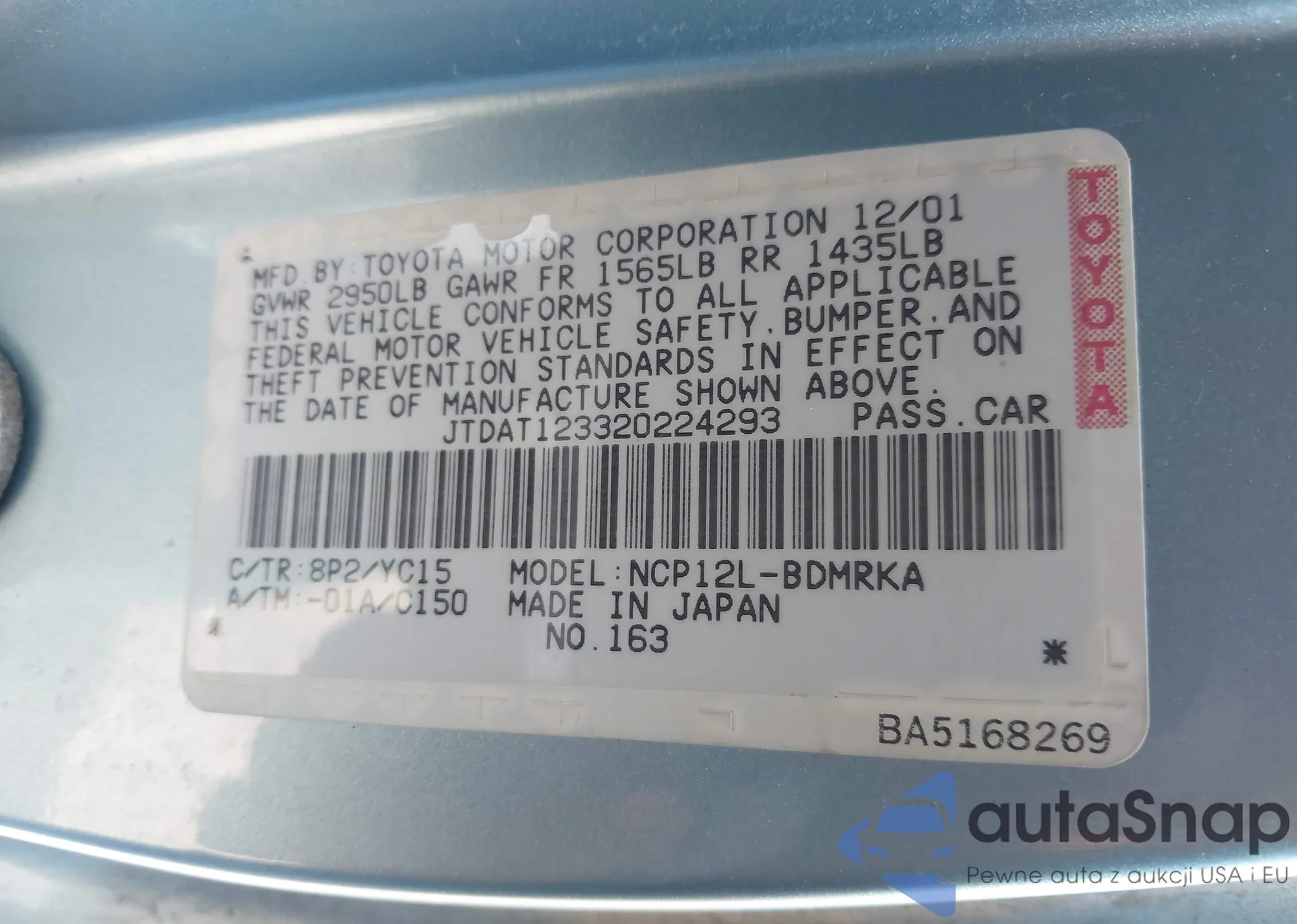 2002 Toyota Echo from USA, damaged, VIN JTDAT123320224293