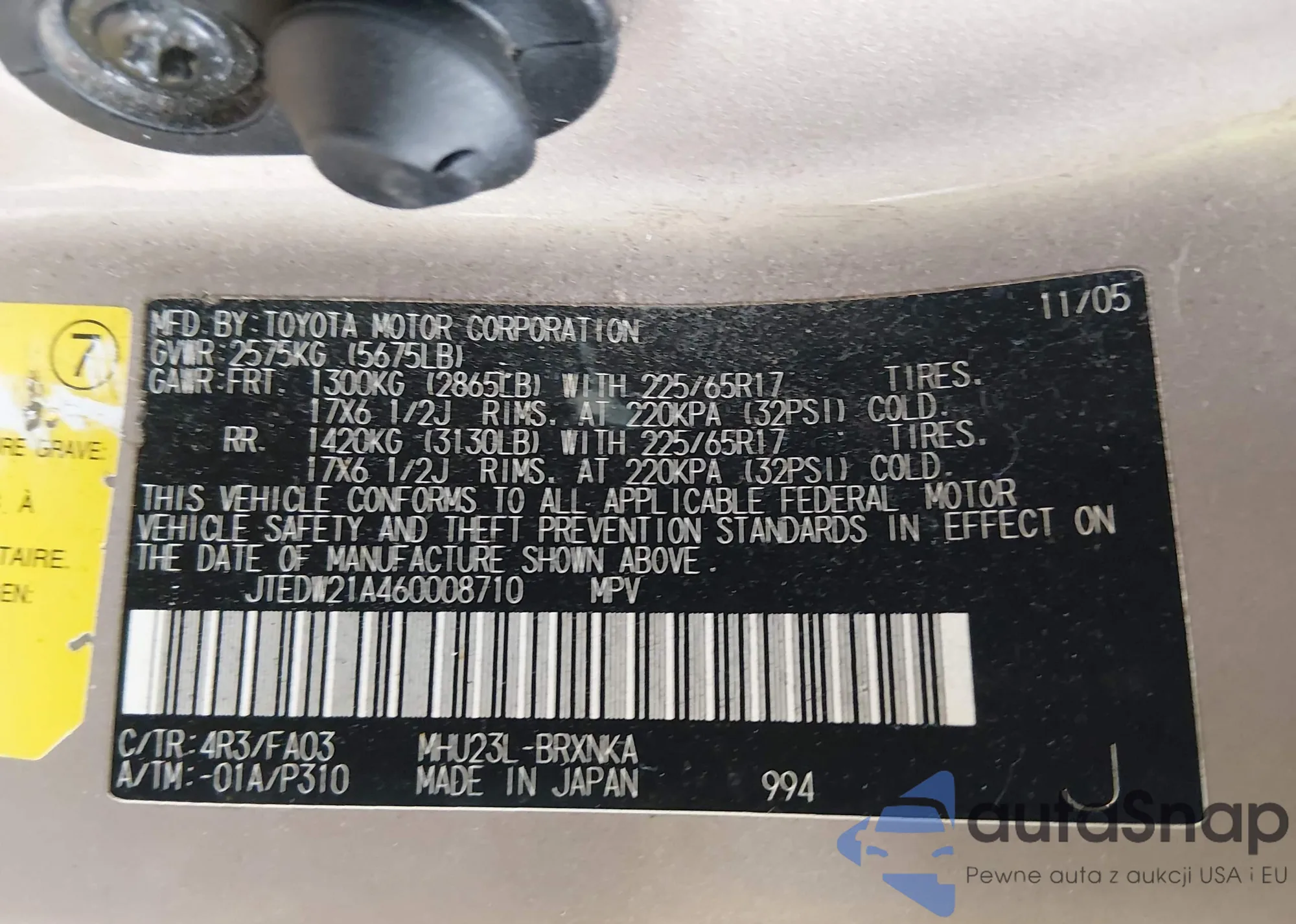 LOT: 44370982 VIN: JTEDW21A460008710