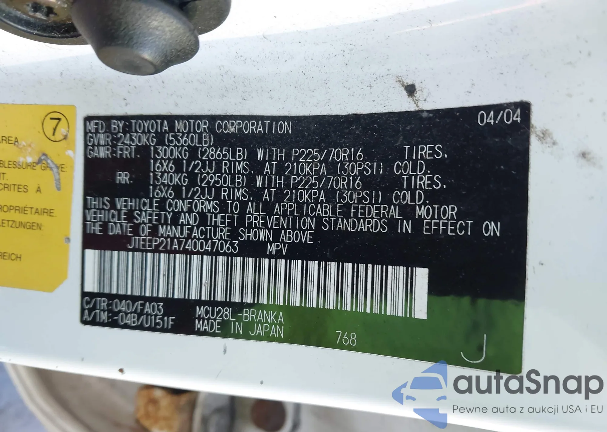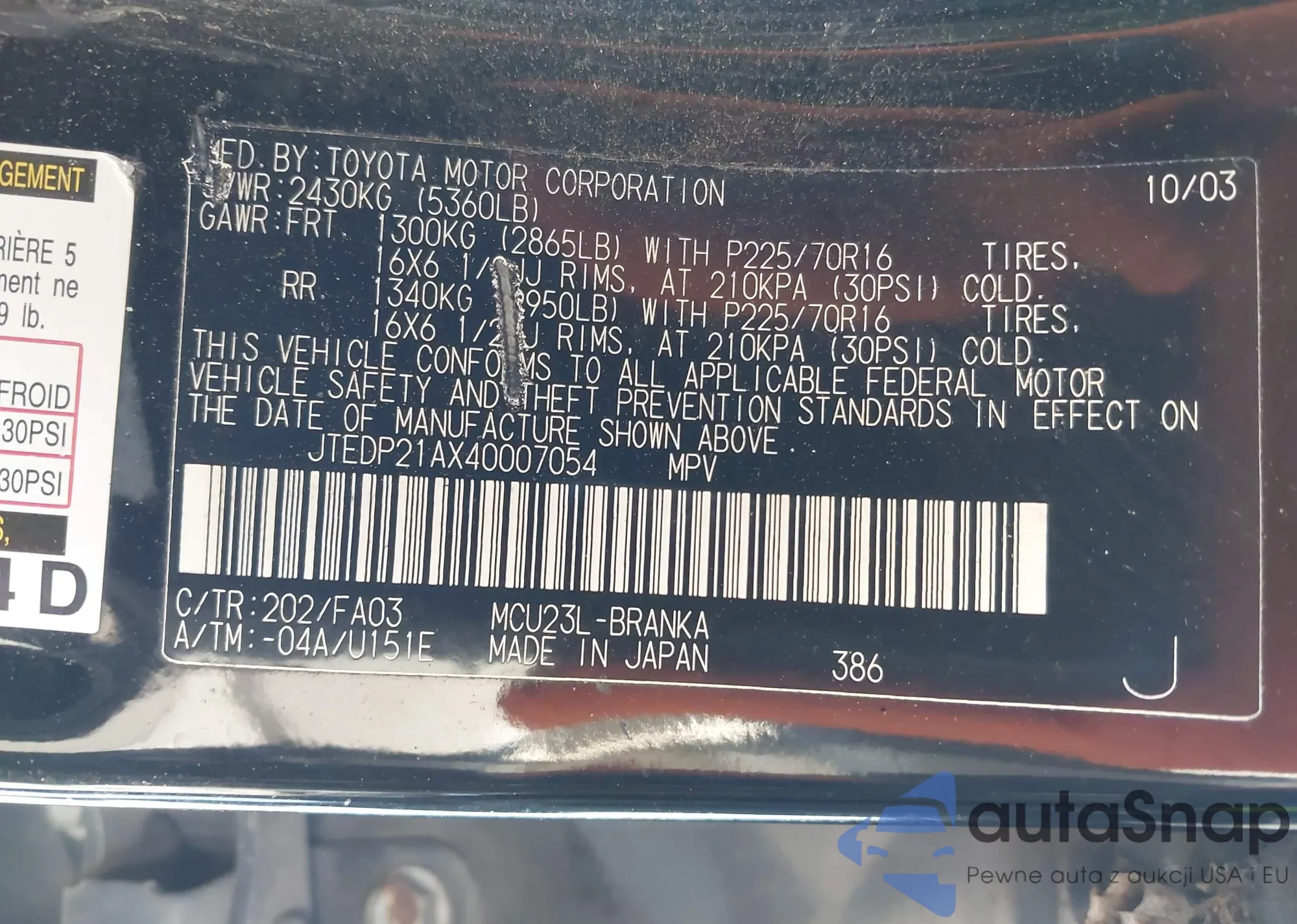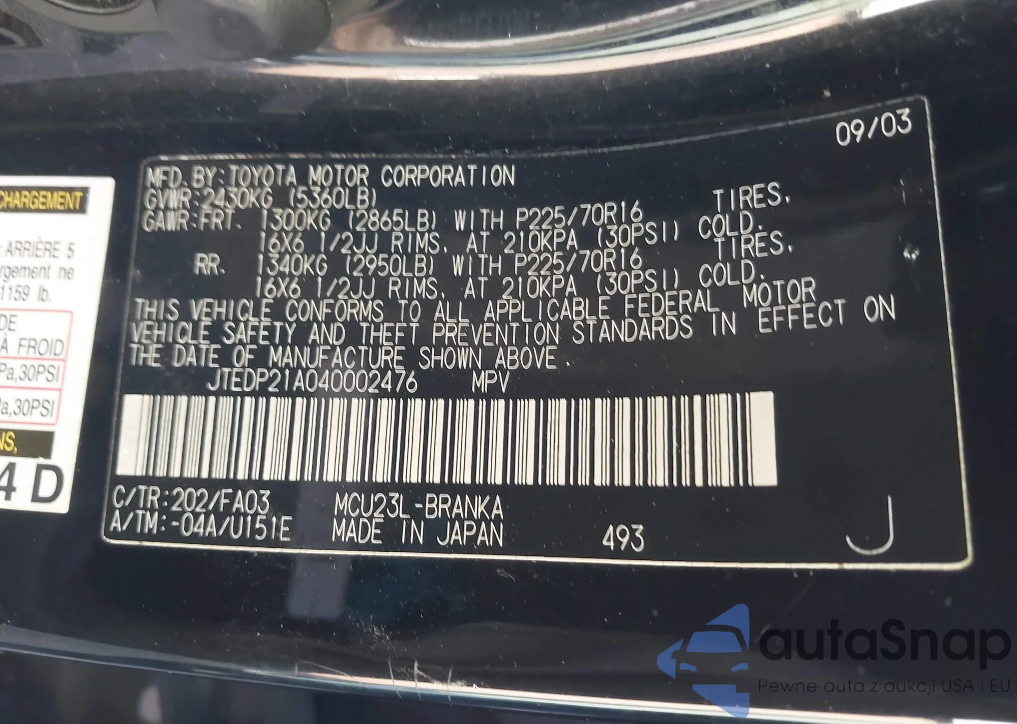 LOT: 44399670 VIN: JTEDP21A040002476