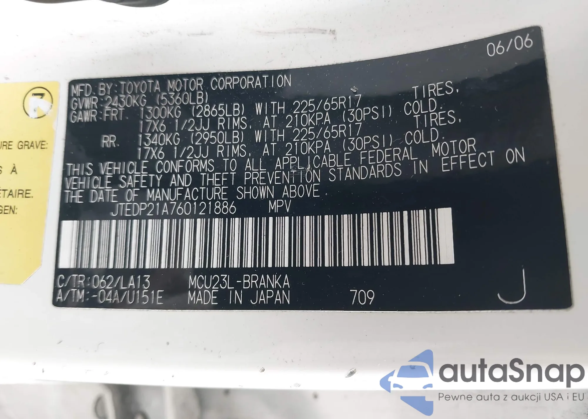 LOT: 44389037 VIN: JTEDP21A760121886