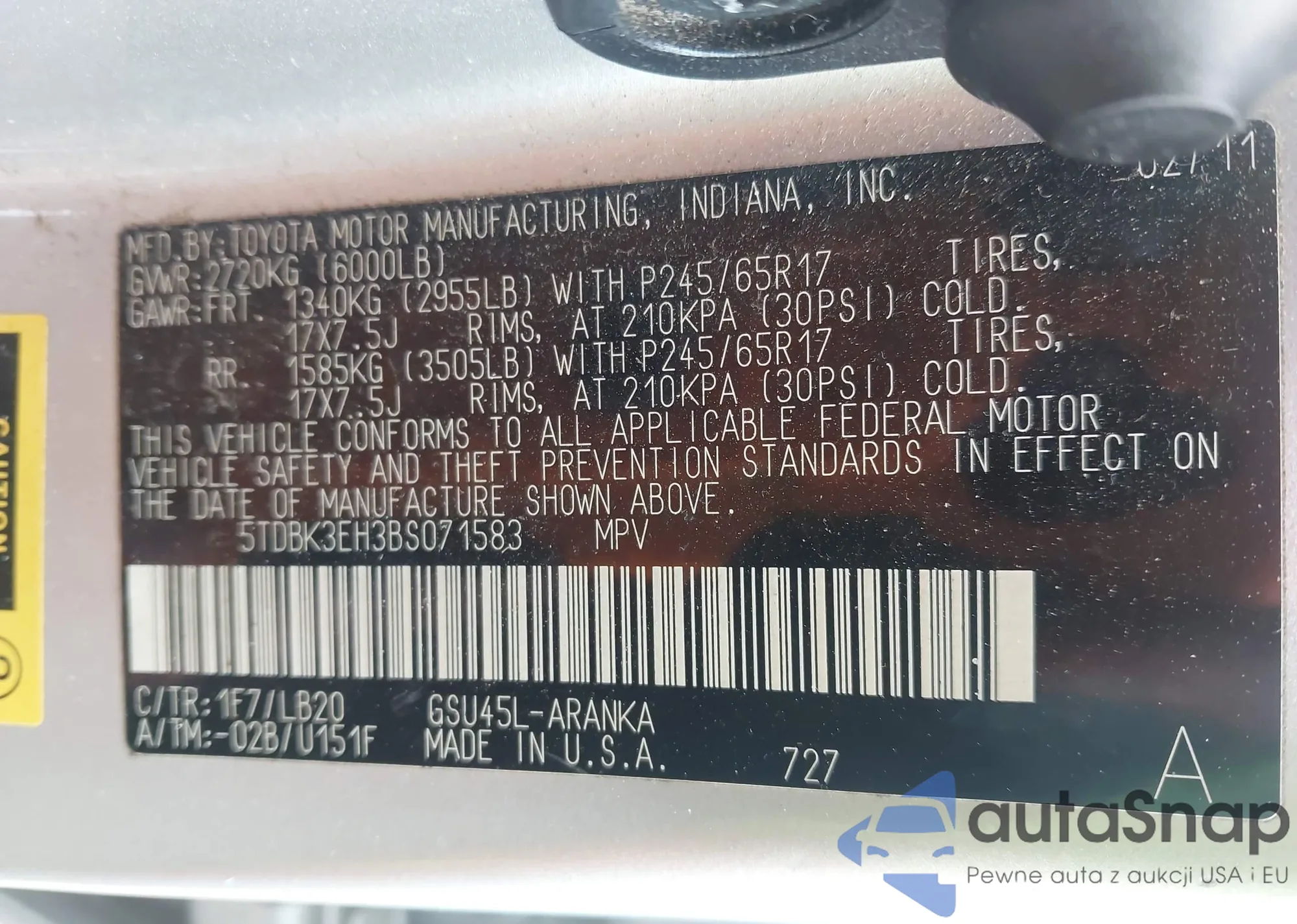 LOT: 44420061 VIN: 5TDBK3EH3BS071583