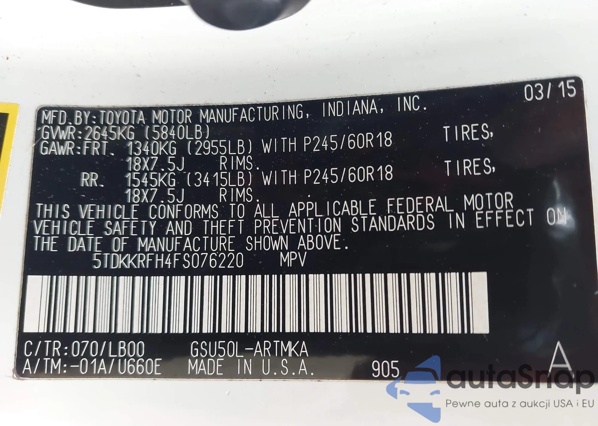 LOT: 43984250 VIN: 5TDKKRFH4FS076220