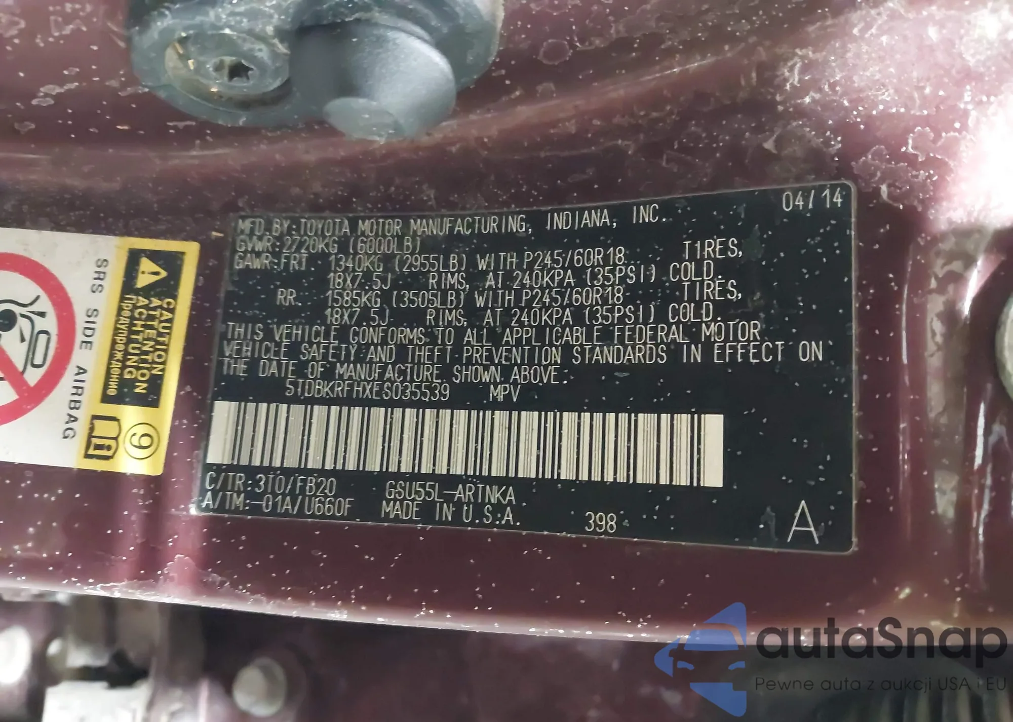 LOT: 43991896 VIN: 5TDBKRFHXES035539