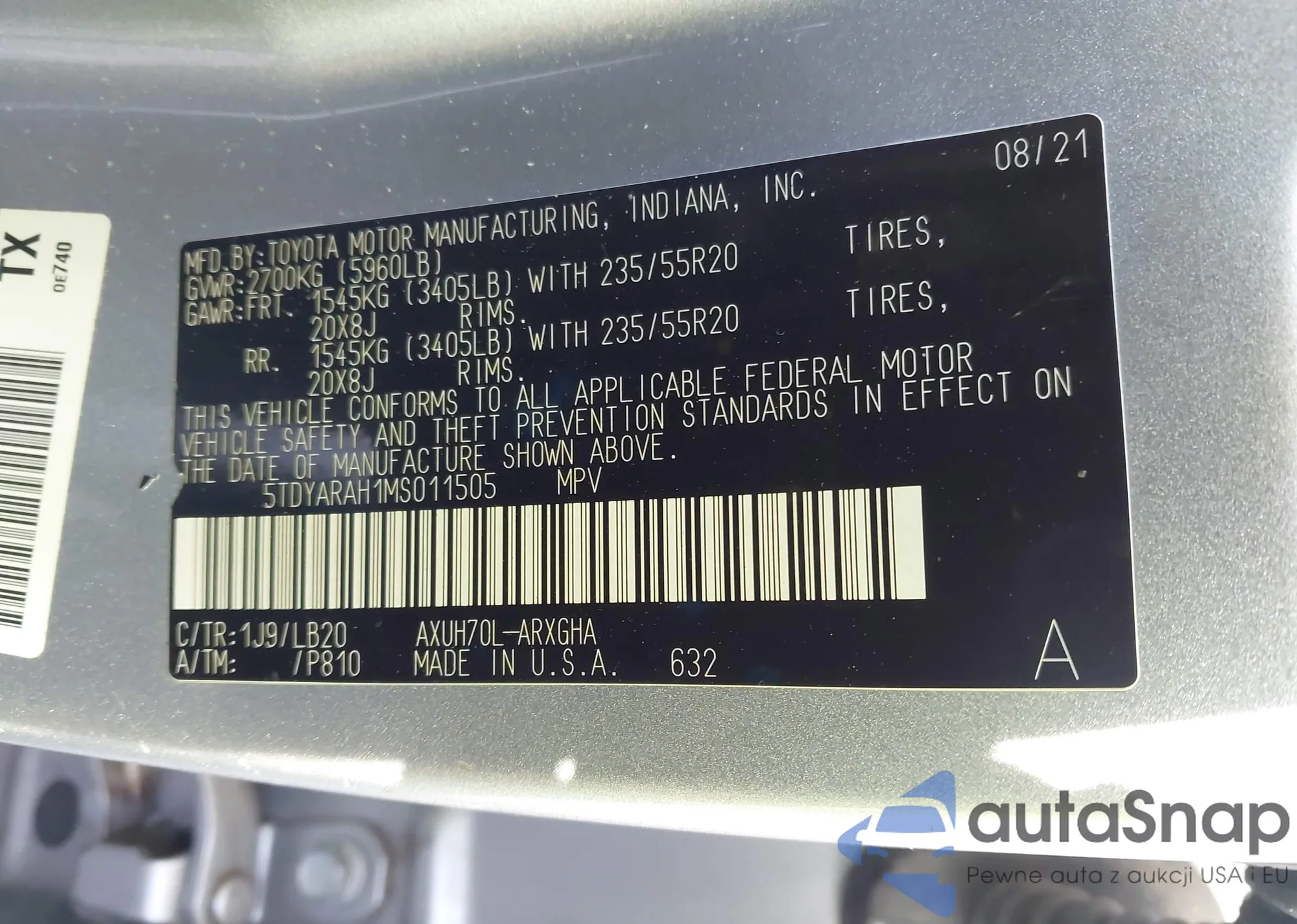 LOT: 44286201 VIN: 5TDYARAH1MS011505